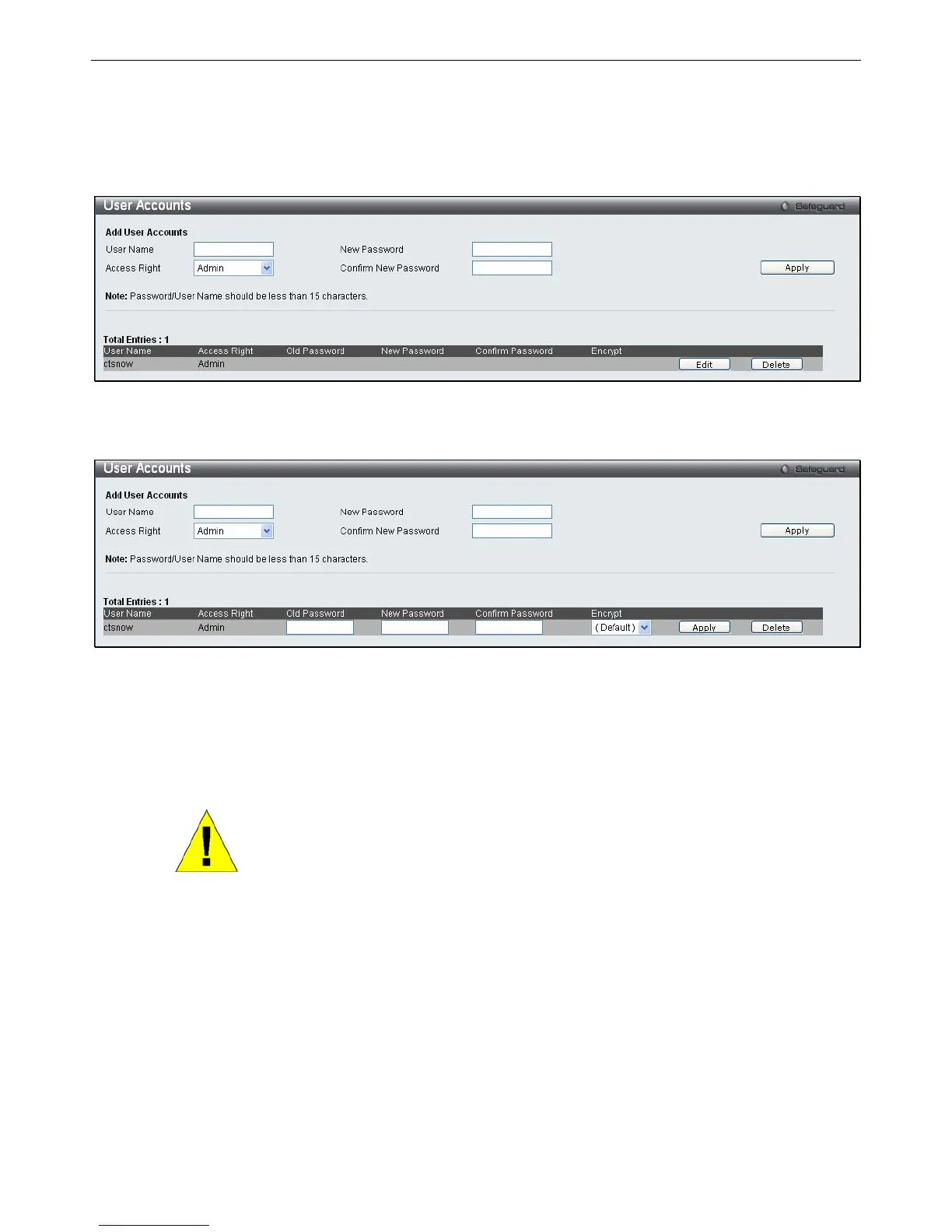 the type of encryption desired (Plain Text or Sha 1), and then click Apply. The level of privilege (Admin or User) can be viewed