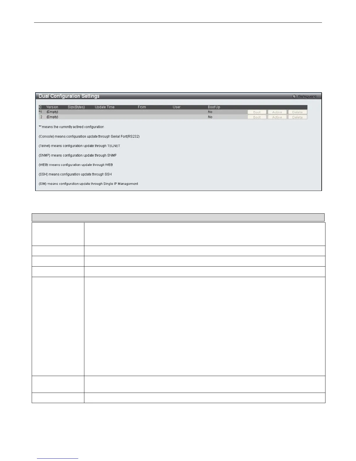Users can display dual configuration settings on the Switch. The Switch allows two firmware images to be stored in its memory