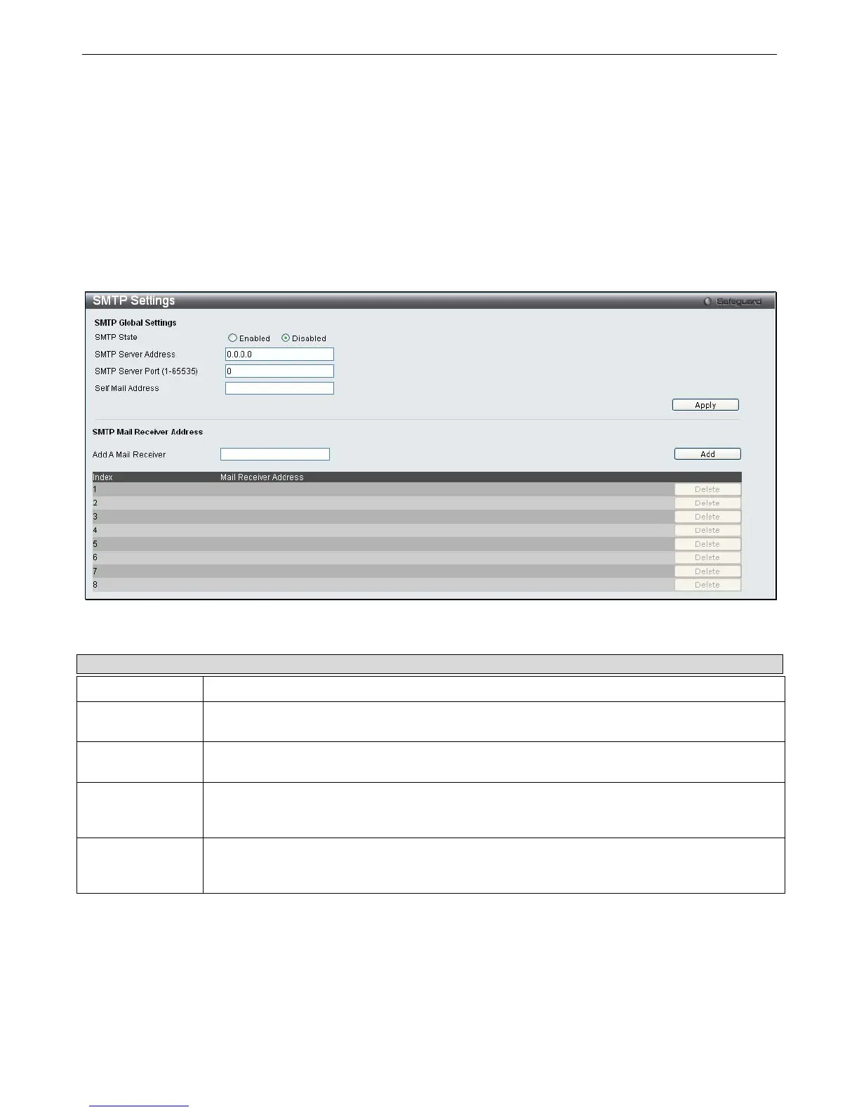 addresses entered in the window below. The Switch is to be configured as a client of SMTP while the server is a remote device
