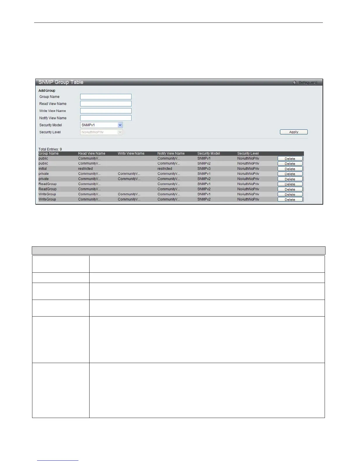 To delete an existing SNMP Group Table entry, click the Delete button next to the corresponding entry.