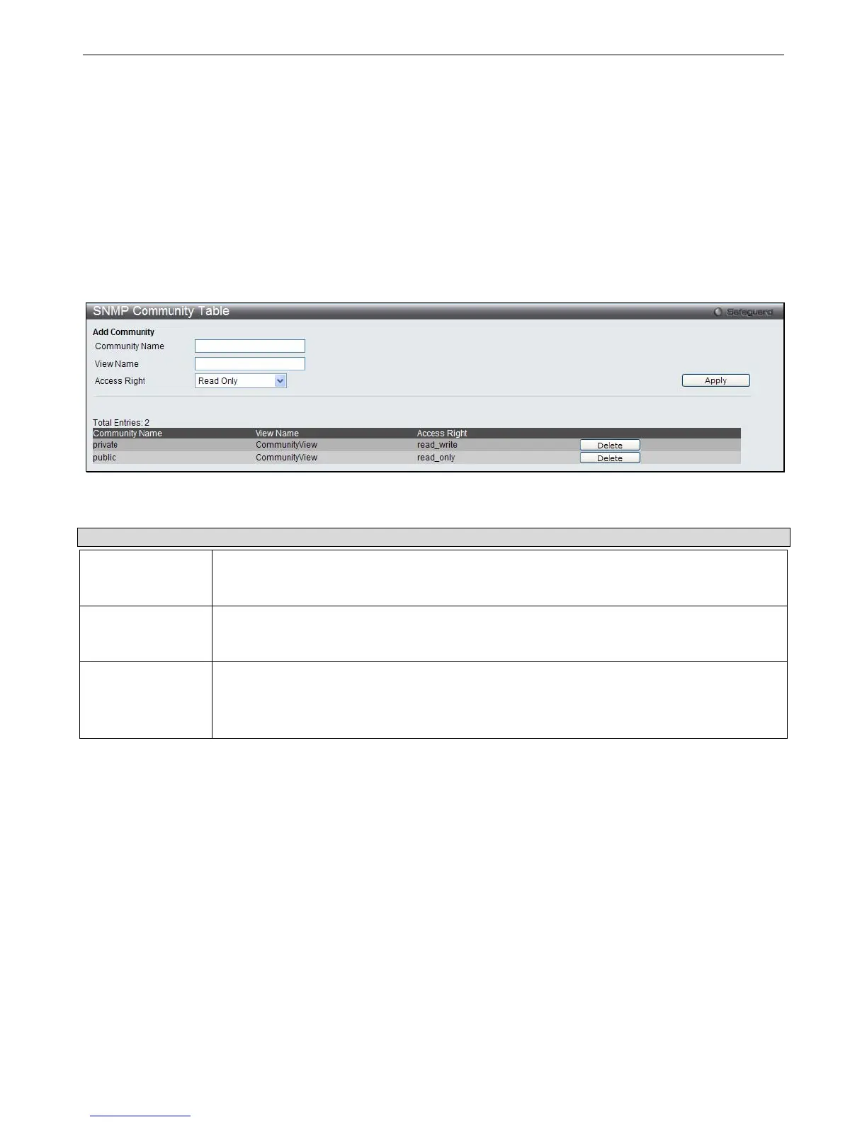 To implement the new settings, click Apply. To delete an entry from the SNMP Community Table, click the Delete button