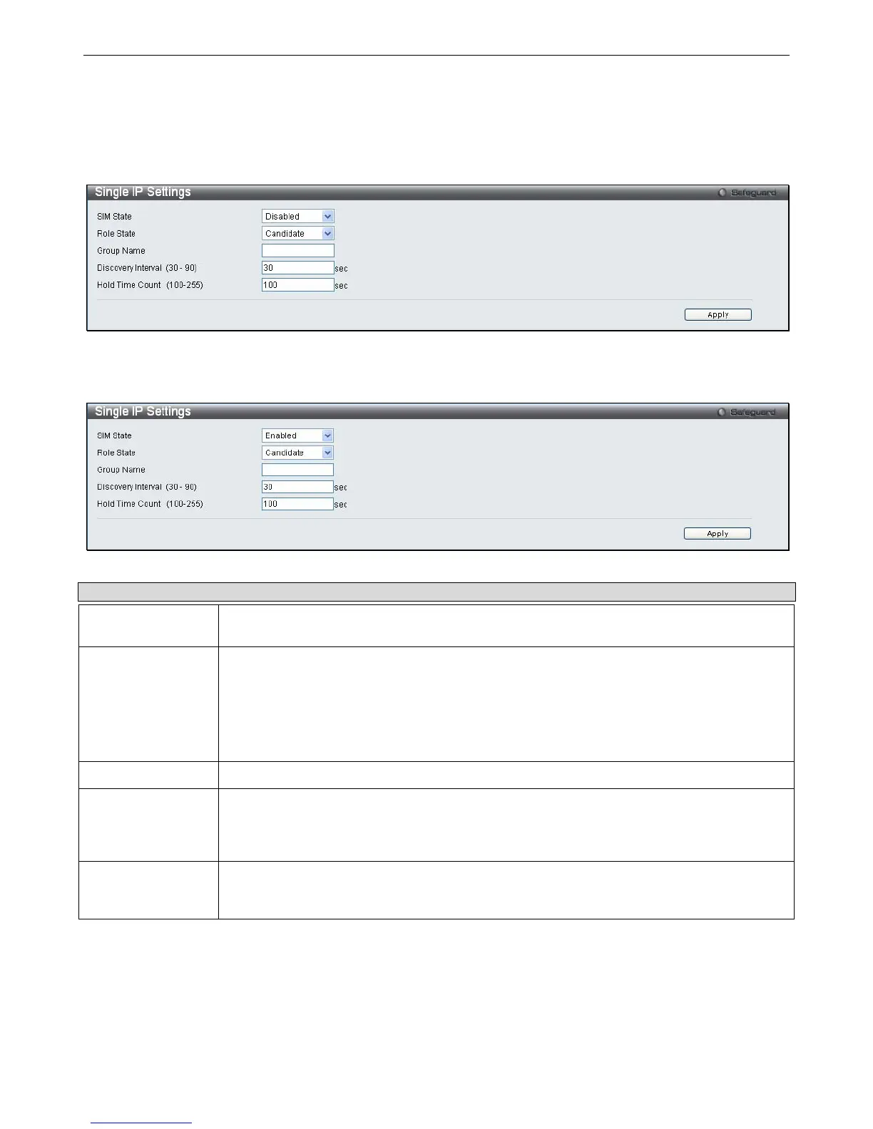 To enable SIM for the Switch using the Web interface, click Configuration > Single IP Management > SIM Settings: