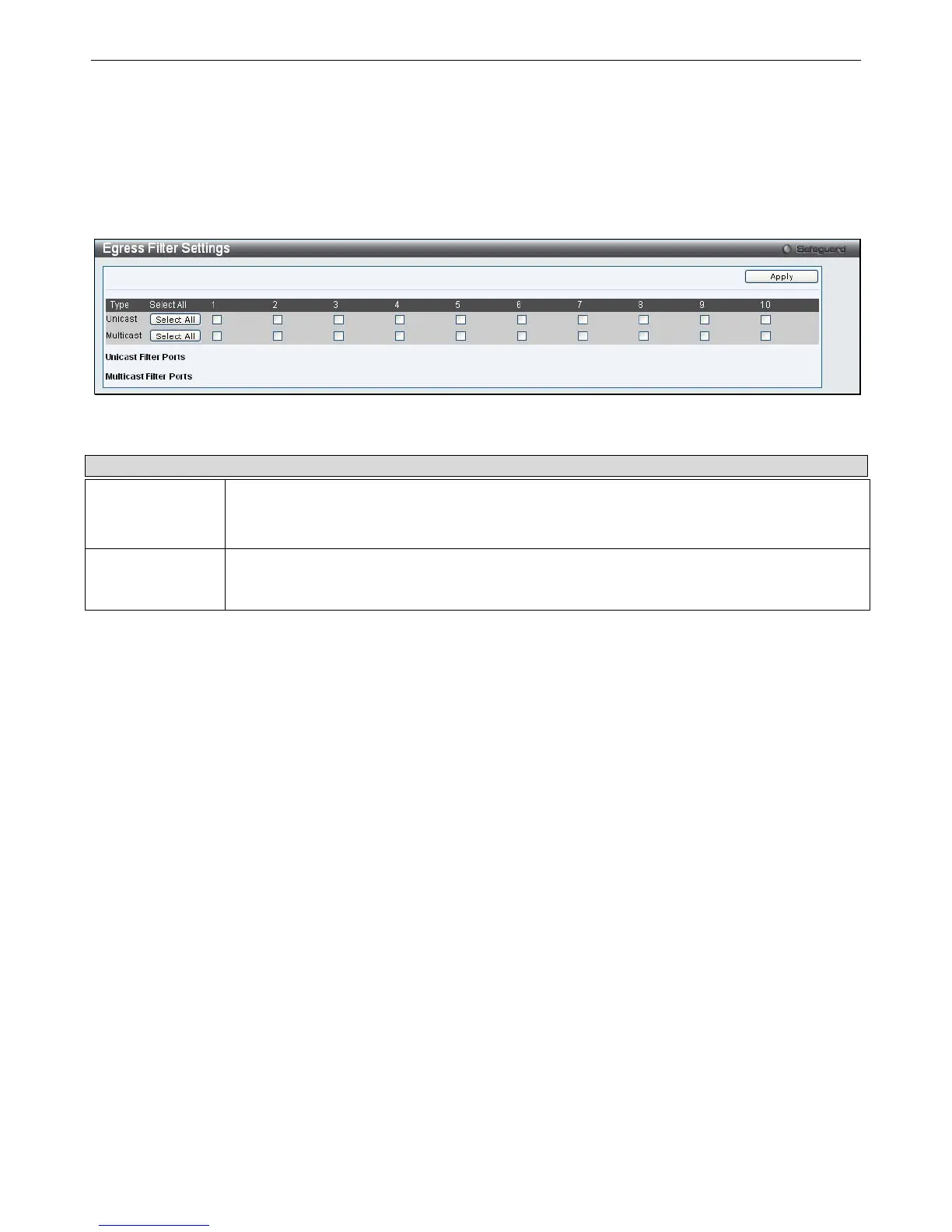 To view the following window, click Layer 2 Features > Egress Filter Settings: