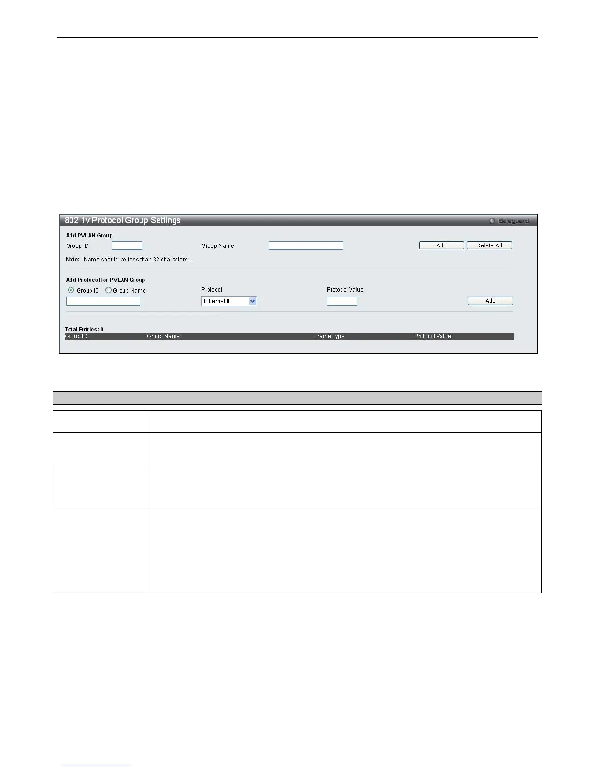 This is used to identify the new Protocol VLAN group. Type an alphanumeric string of up to 32