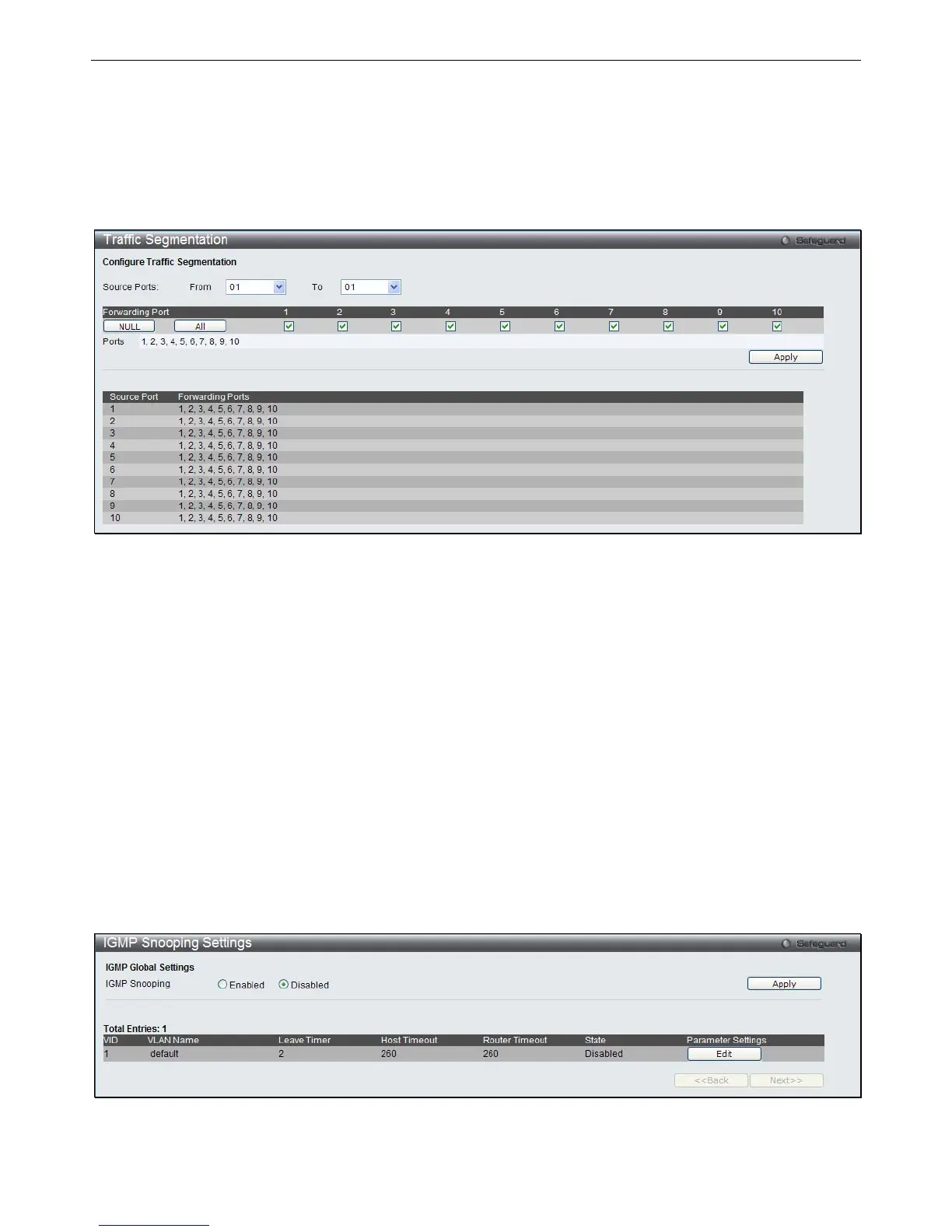 Clicking the Apply button will enter the combination of transmitting port(s) and allowed receiving ports into the Switch’s Traffic