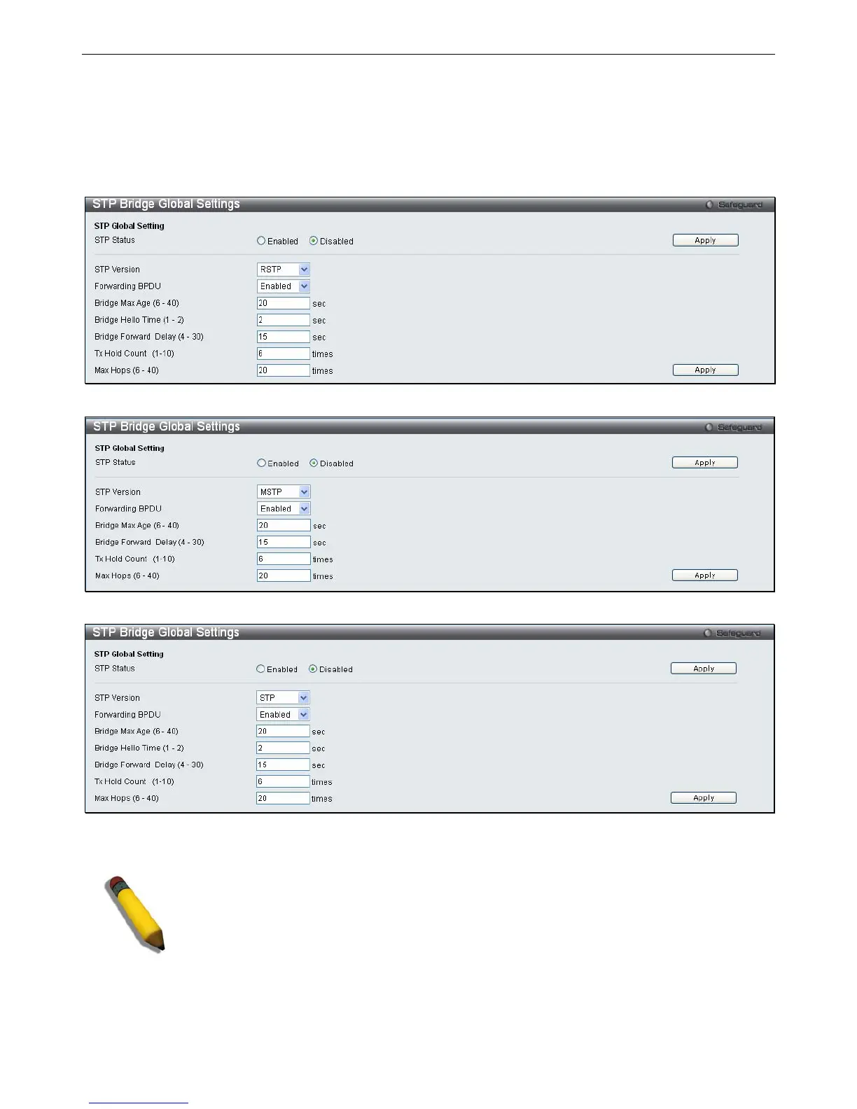 To view the following windows, click L2 Features > Spanning Tree > STP Bridge Global Settings: