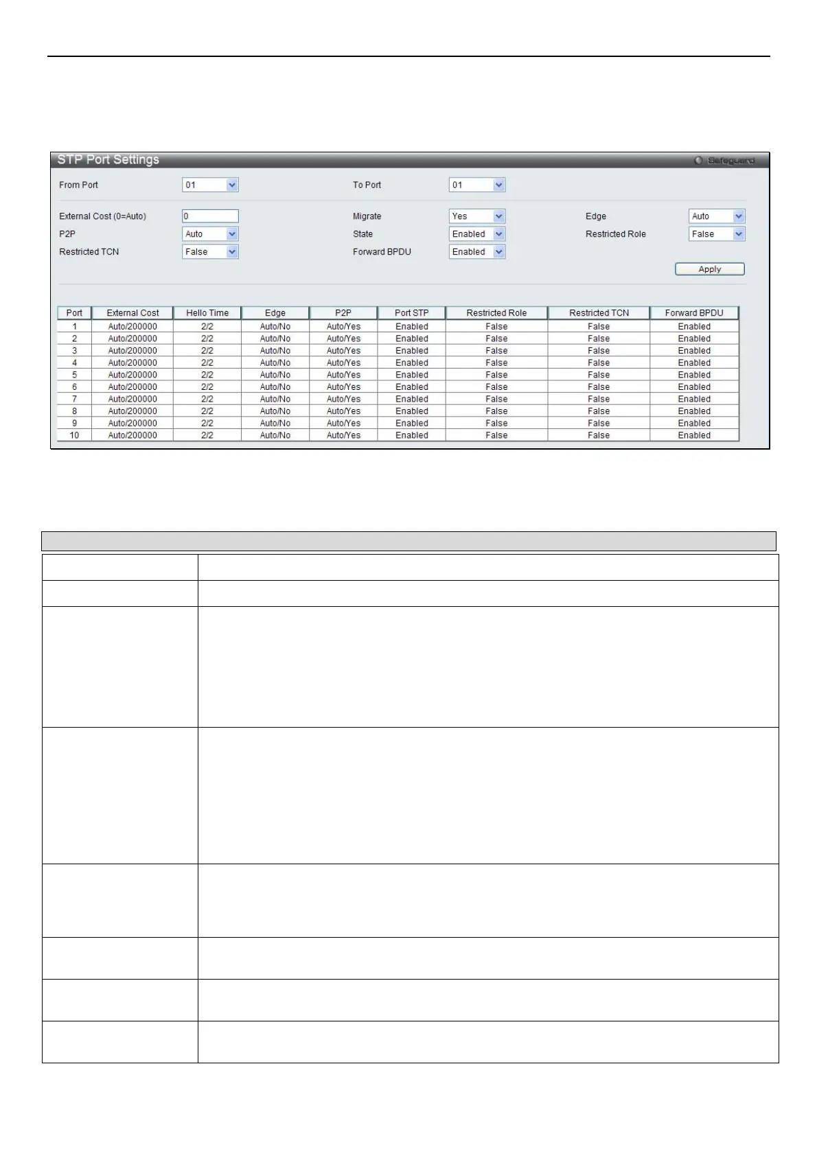 STP can be set up on a port per port basis. To view the STP Port Settings window, click L2 Features > Spanning Tree > STP