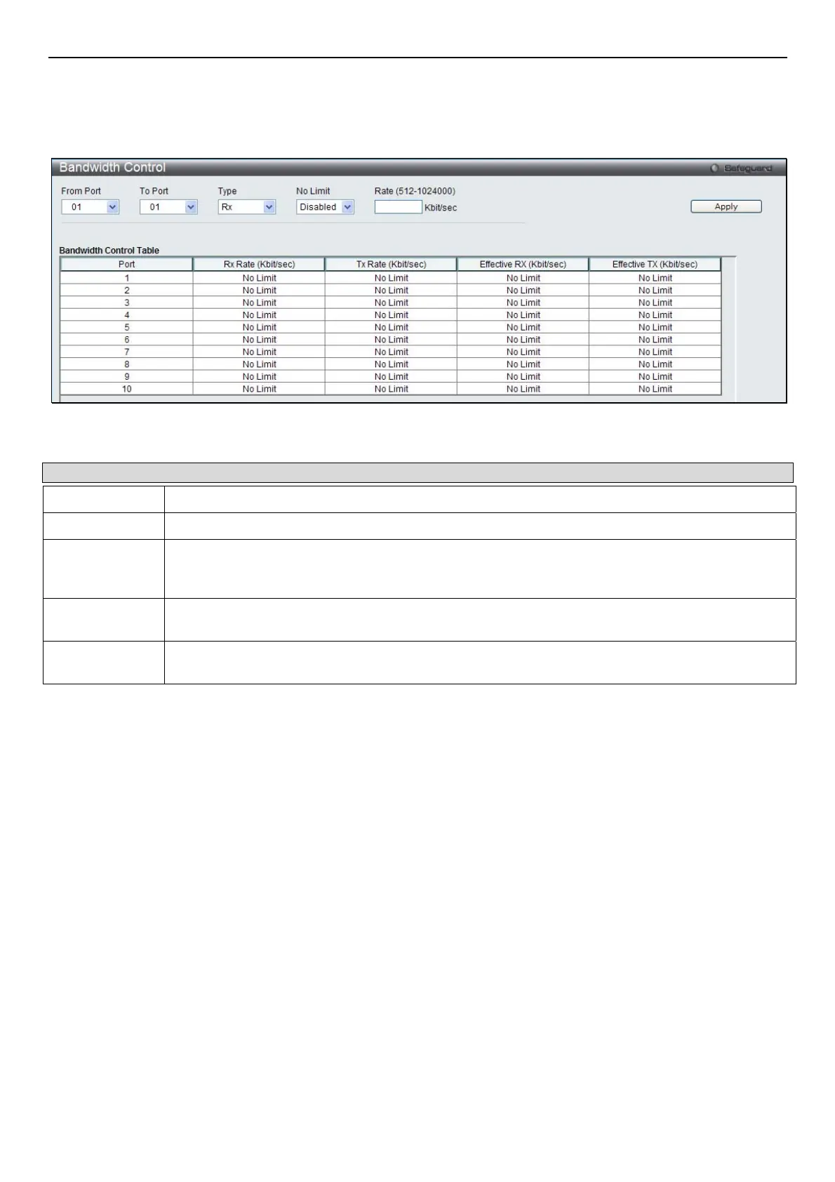 The bandwidth control settings are used to place a ceiling on the transmitting and receiving data rates for any selected port. In the