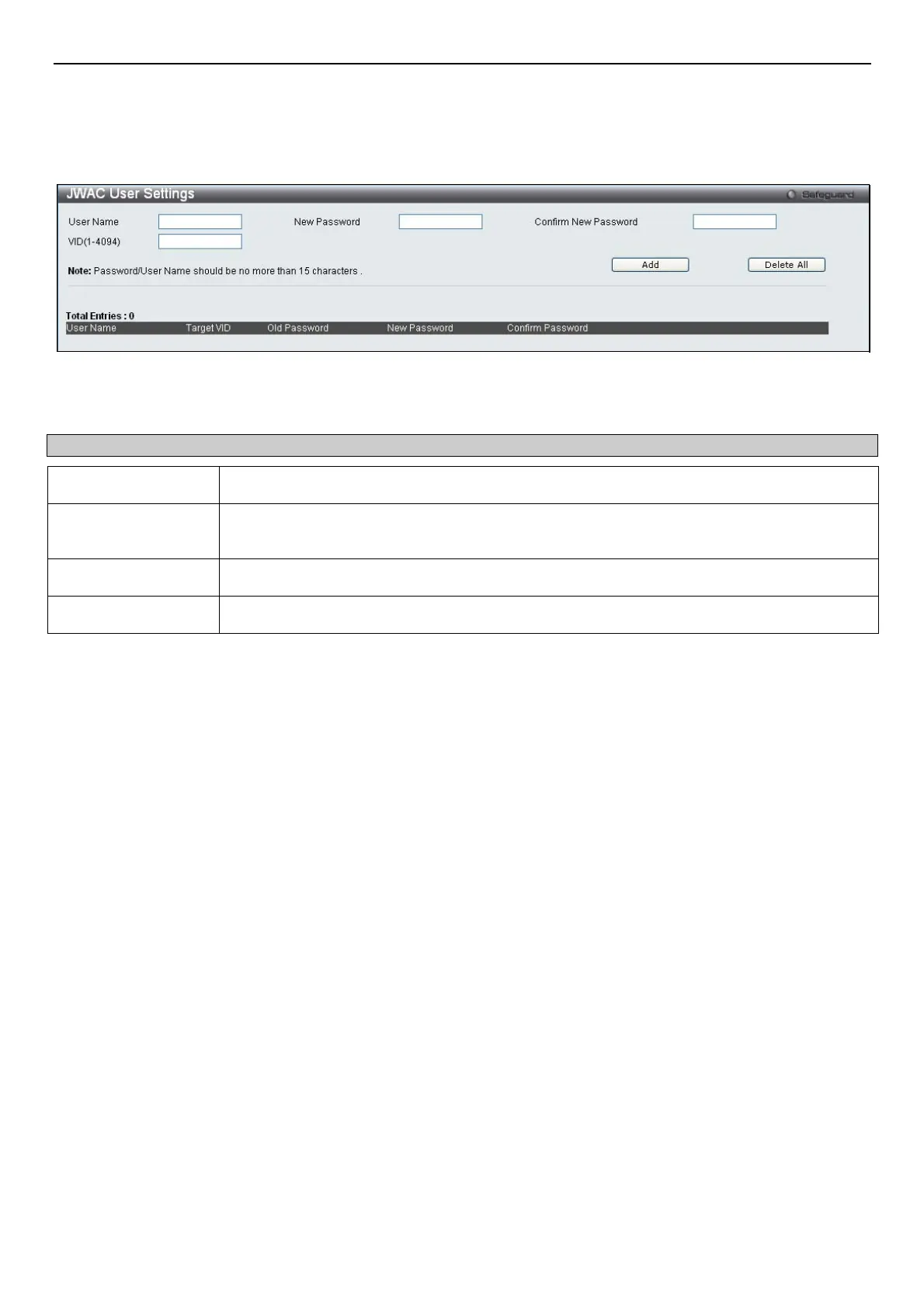 To set the User Account settings for the JWAC by the Switch, complete the following fields and then click the Add button. To