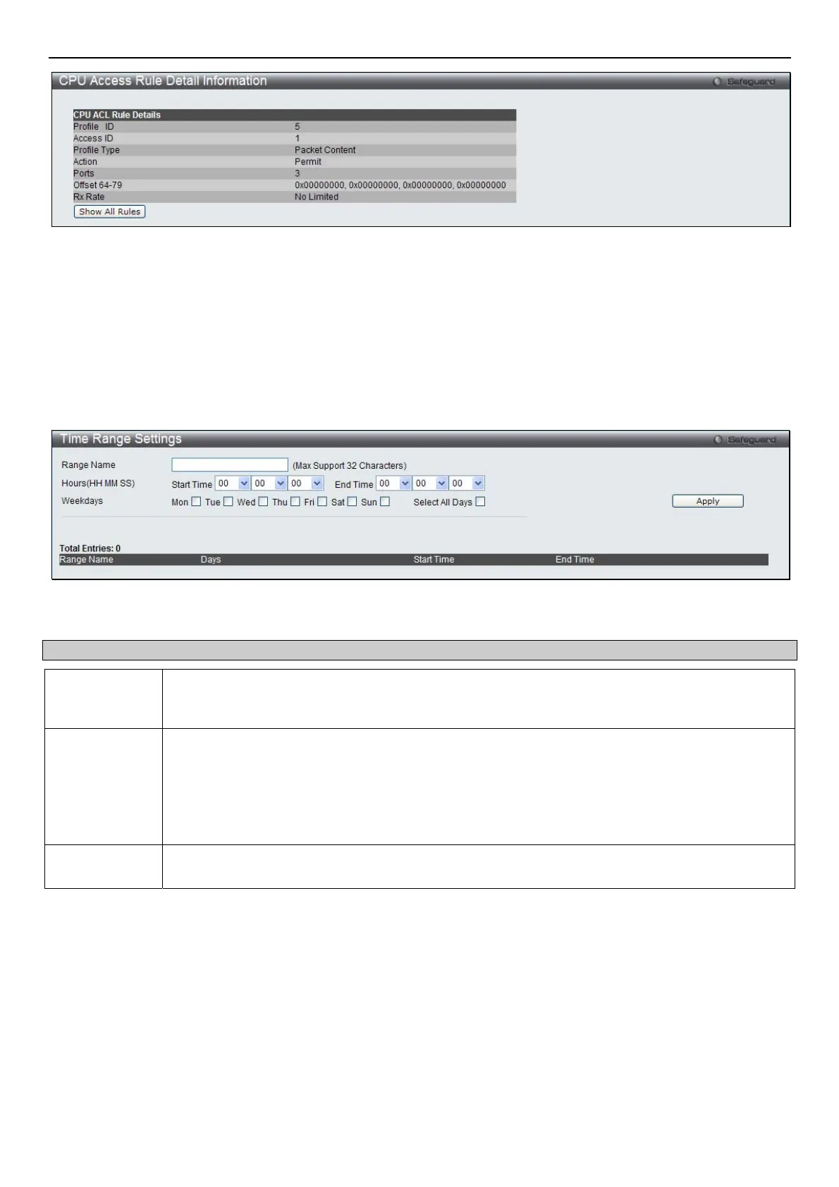 Click Apply to implement changes made. Currently configured entries will be displayed in the Time Range Information table in