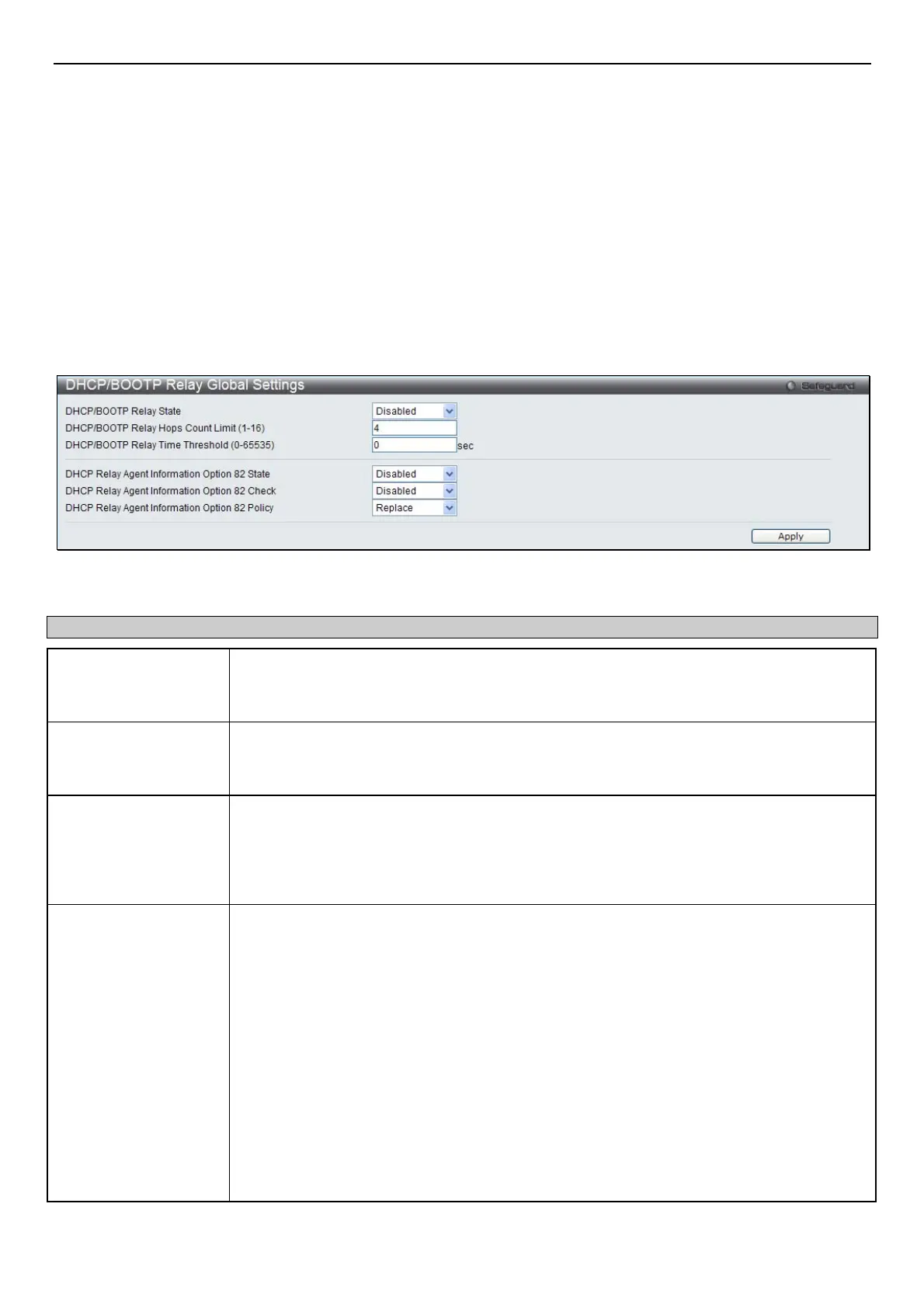 To enable and configure DHCP/BOOTP Relay Global Settings on the Switch, click Configuration > DHCP/BOOTP Relay >