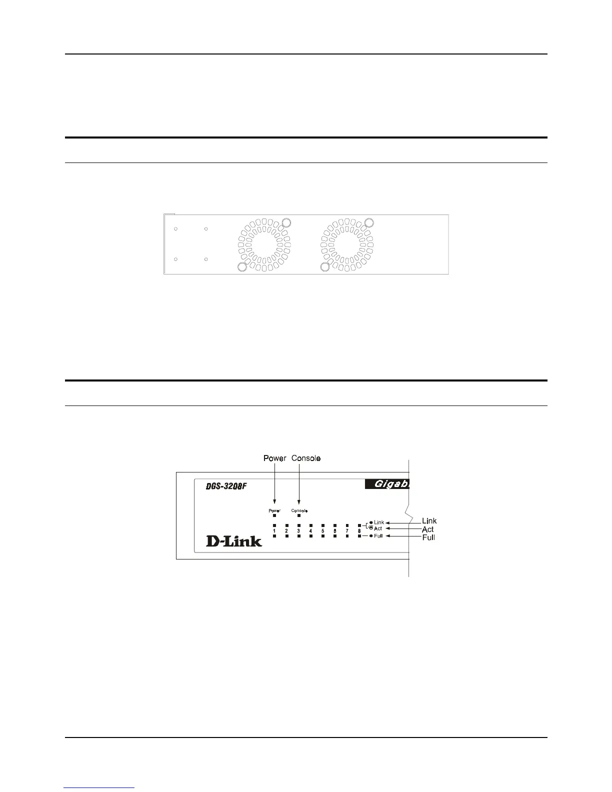 The LED indicators of the Switch include Power, Console, Link/ACT, and Full. The following shows the LED