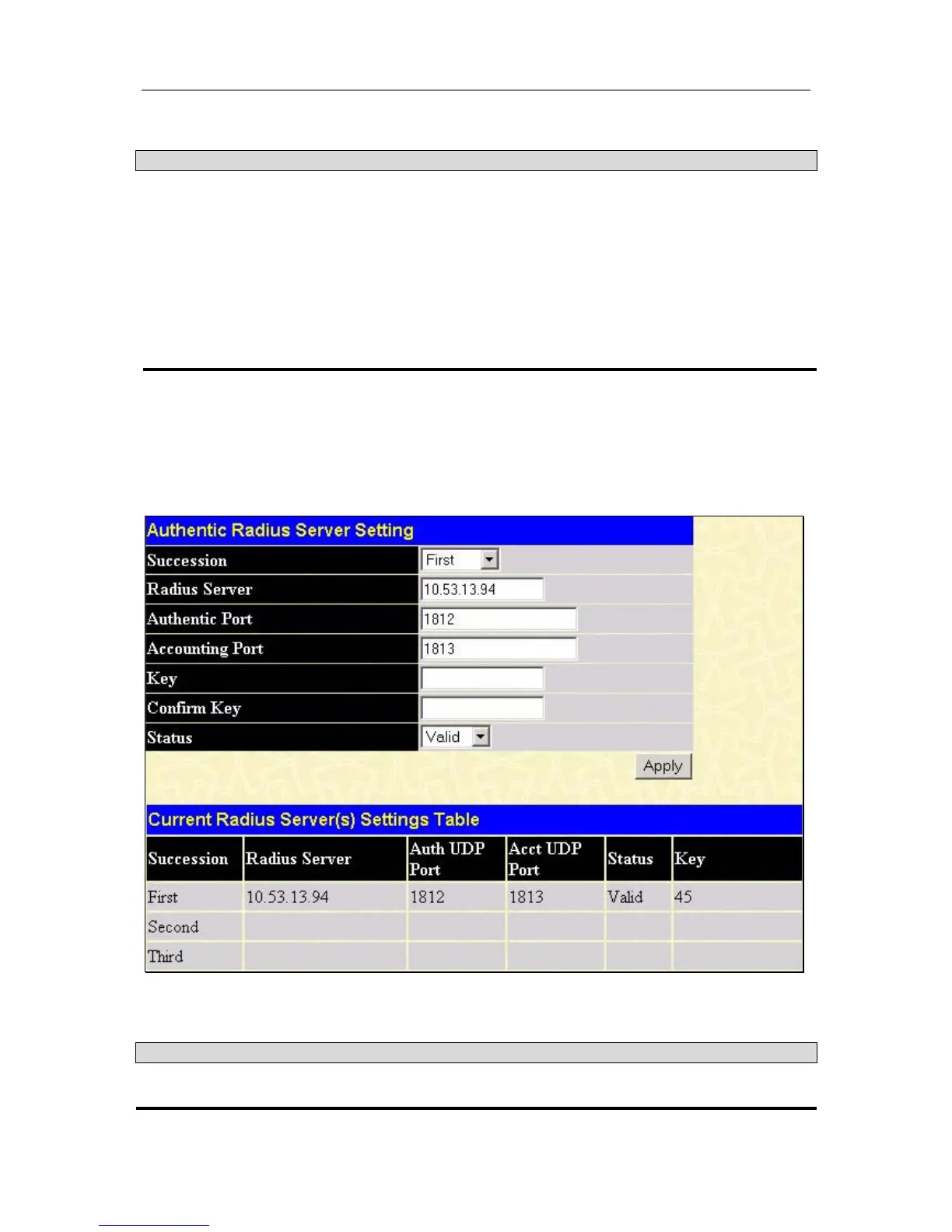 Figure 4- 56. Authentic Radius Server Setting and Current Radius Server(s) Settings Table window