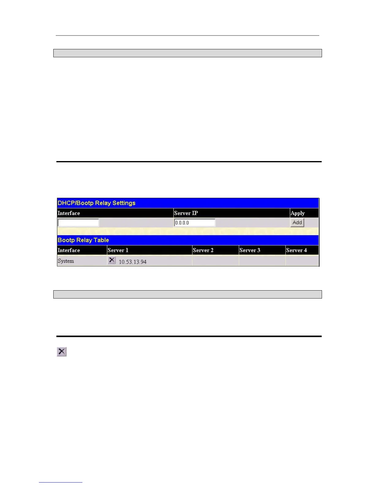 Click Apply to set an entry into the BOOTP Relay Table. Entries may be deleted by clicking it’s corresponding