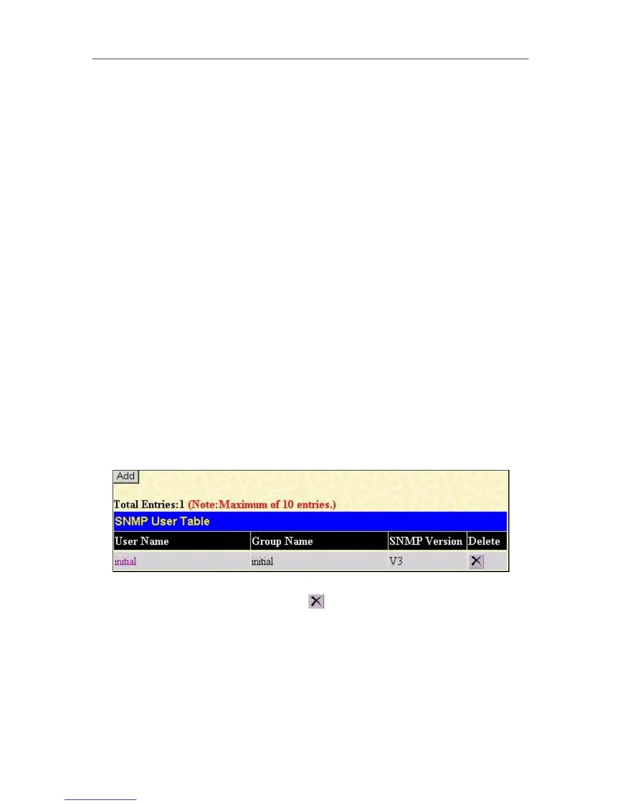 To delete an existing SNMP User Table entry, click the