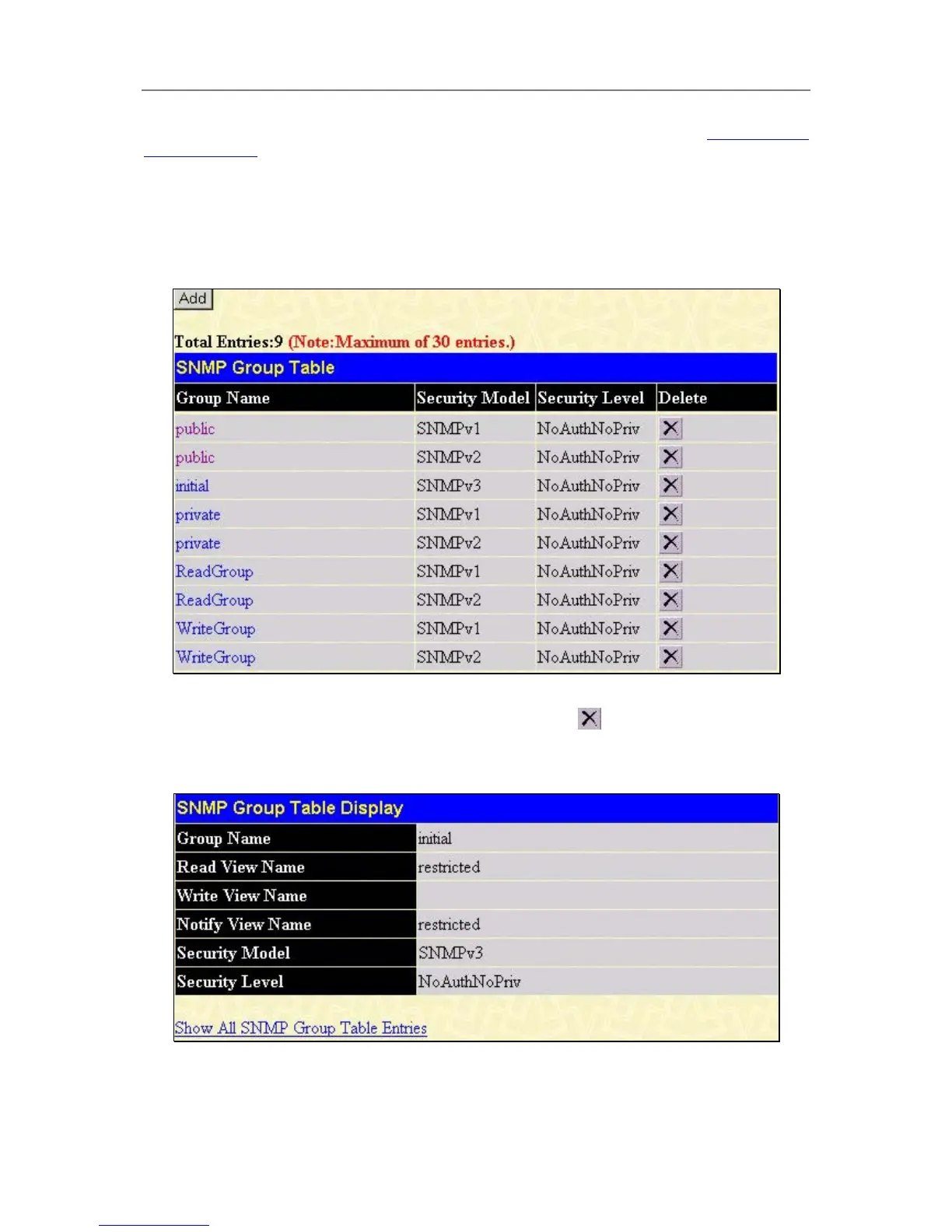 To display the current settings for an existing SNMP Group Table entry, click the blue hyperlink for the entry