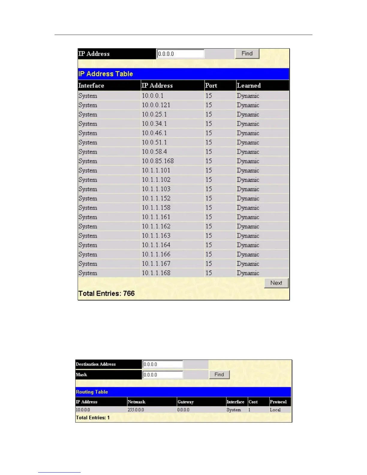 screen shows the current IP routing table of the Switch. To find a specific IP route, enter an IP address into the