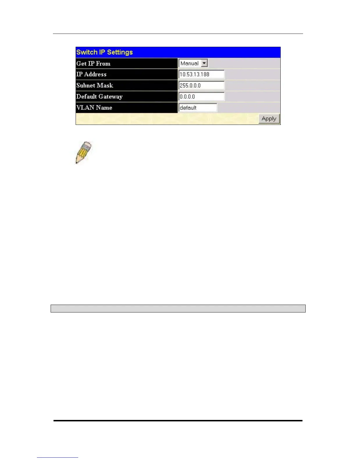 To manually assign the Switch’s IP address, subnet mask, and default gateway address: