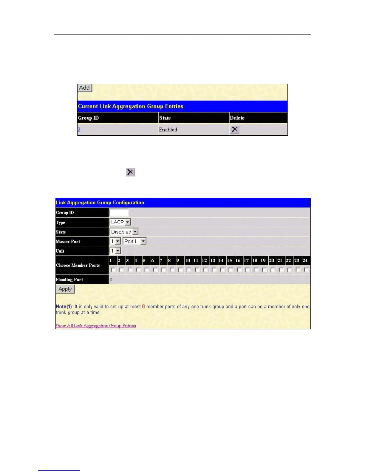 under the Delete heading in the Current Link Aggregation Group Entries