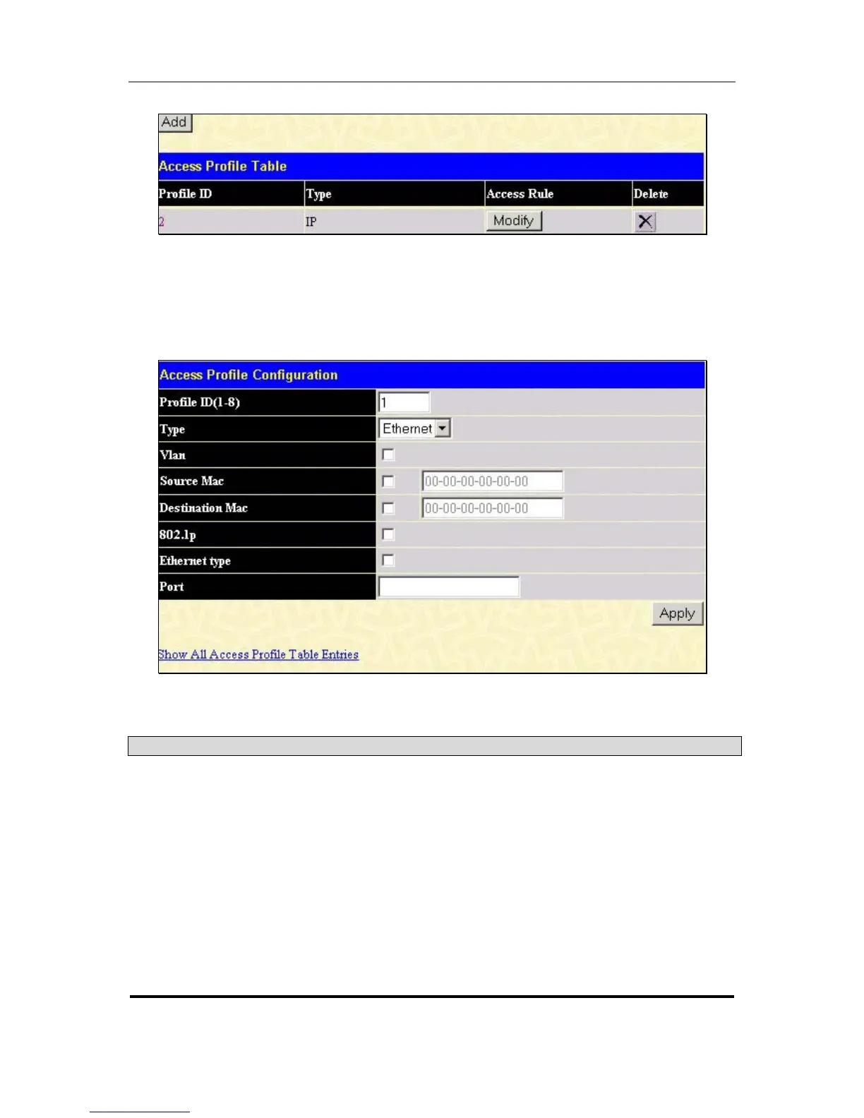 on the Apply button. The page shown below is the Ethernet Access Profile Configuration page.