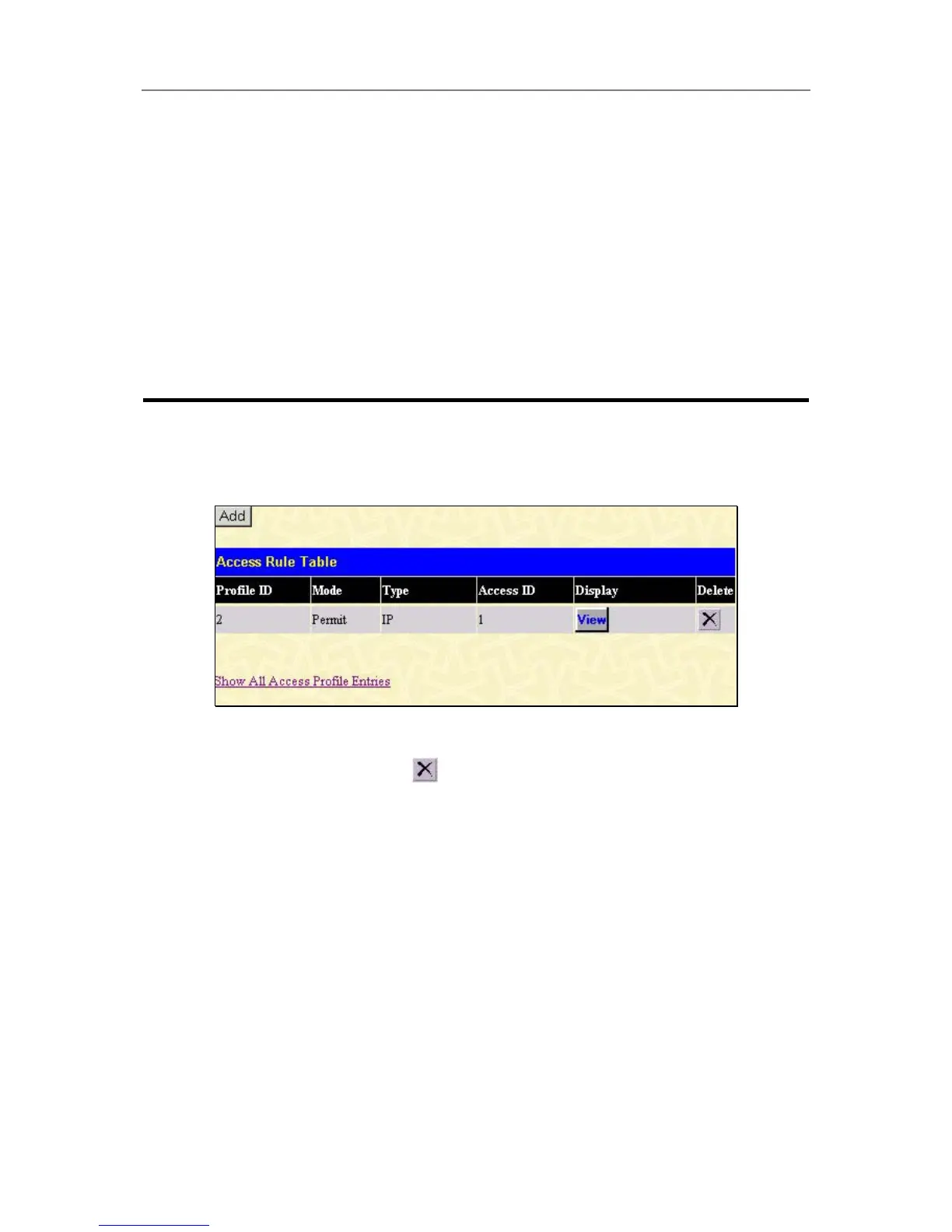 To create a new rule set for the access profile click the Add button. A new window is displayed. To remove a