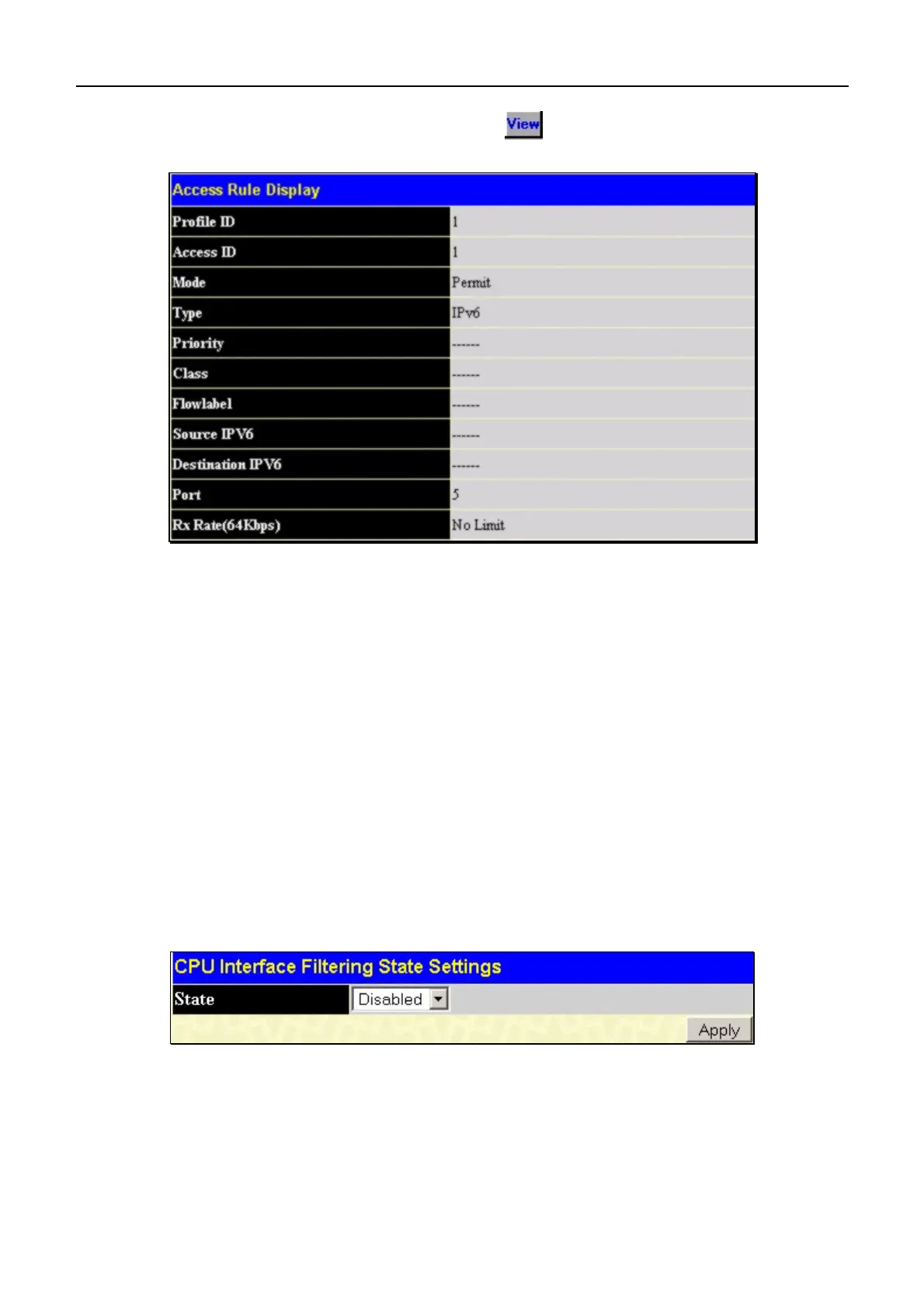 Interface Filtering State. Choose Enabled to enable CPU packets to be scrutinized by the Switch and Disabled to