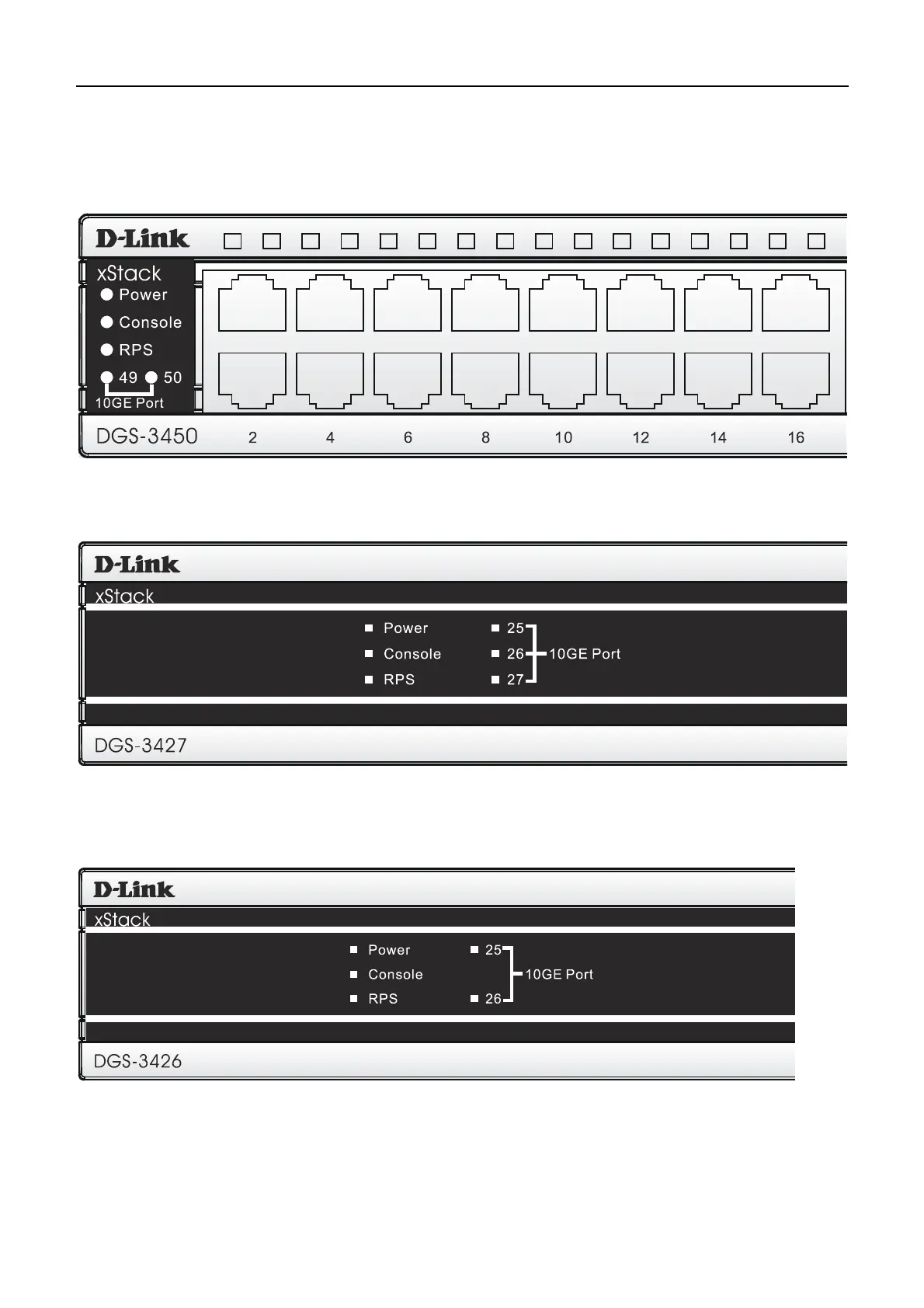 The Switch supports LED indicators for Power, Console, RPS and Port LEDs including 10GE port LEDs for optional