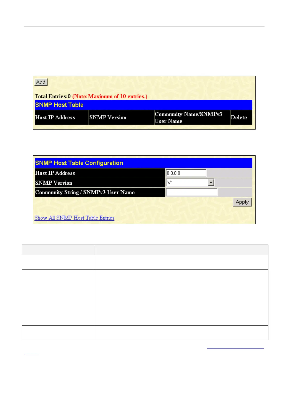 below. To delete an existing SNMP Host Table entry, click the corresponding X under the Delete heading. To display the