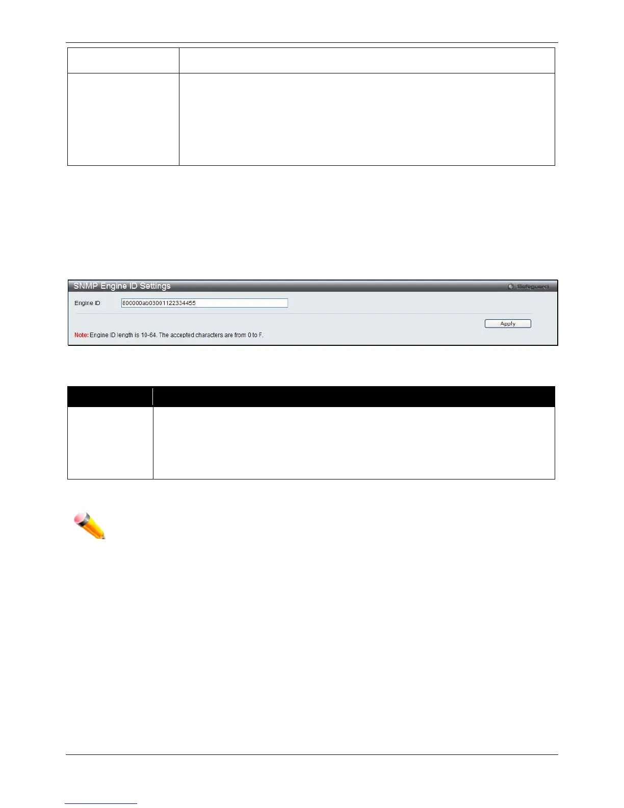 engine ID displays the identification of the SNMP engine on the Switch. The default value is