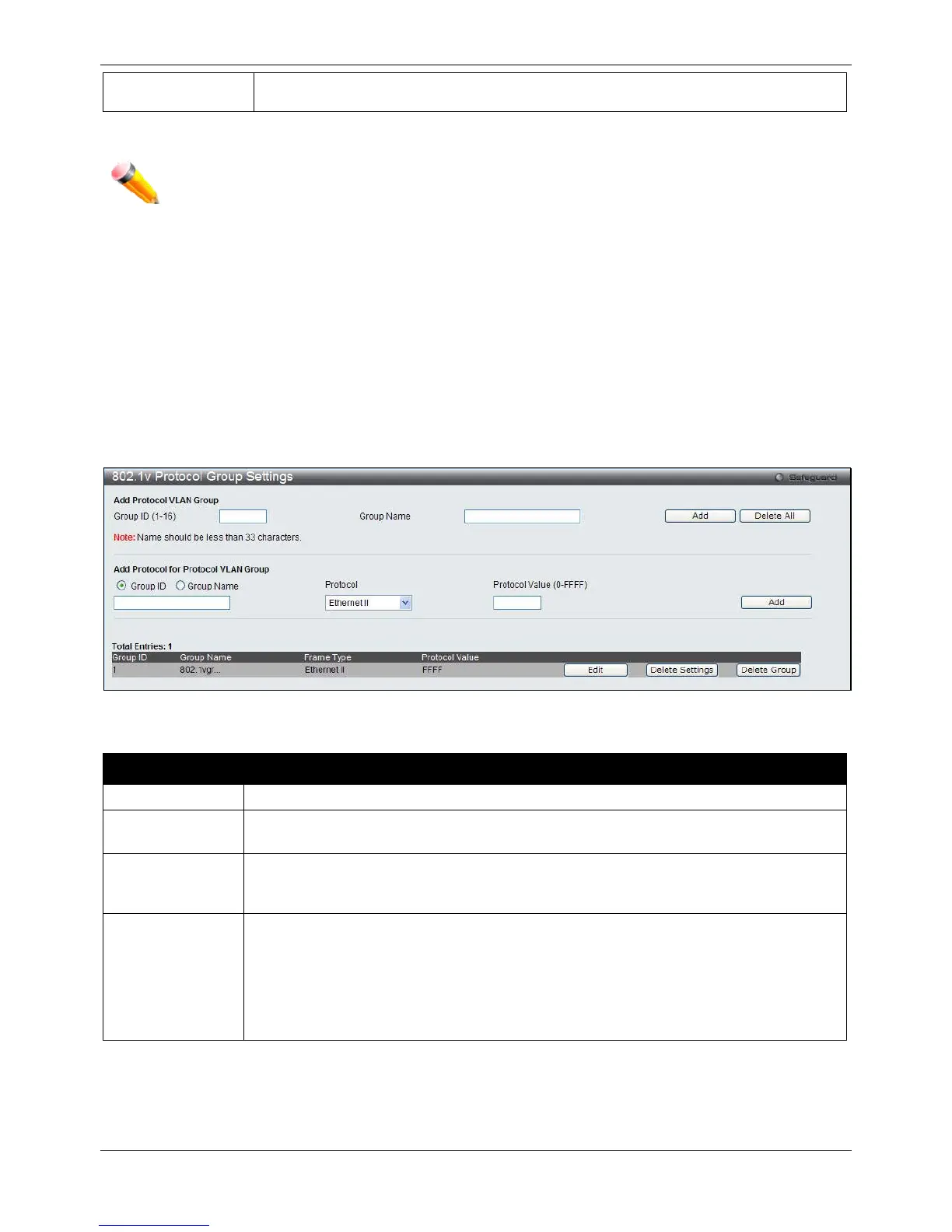 Click the Delete Settings button to remove the Protocol for the Protocol VLAN Group information for the specific