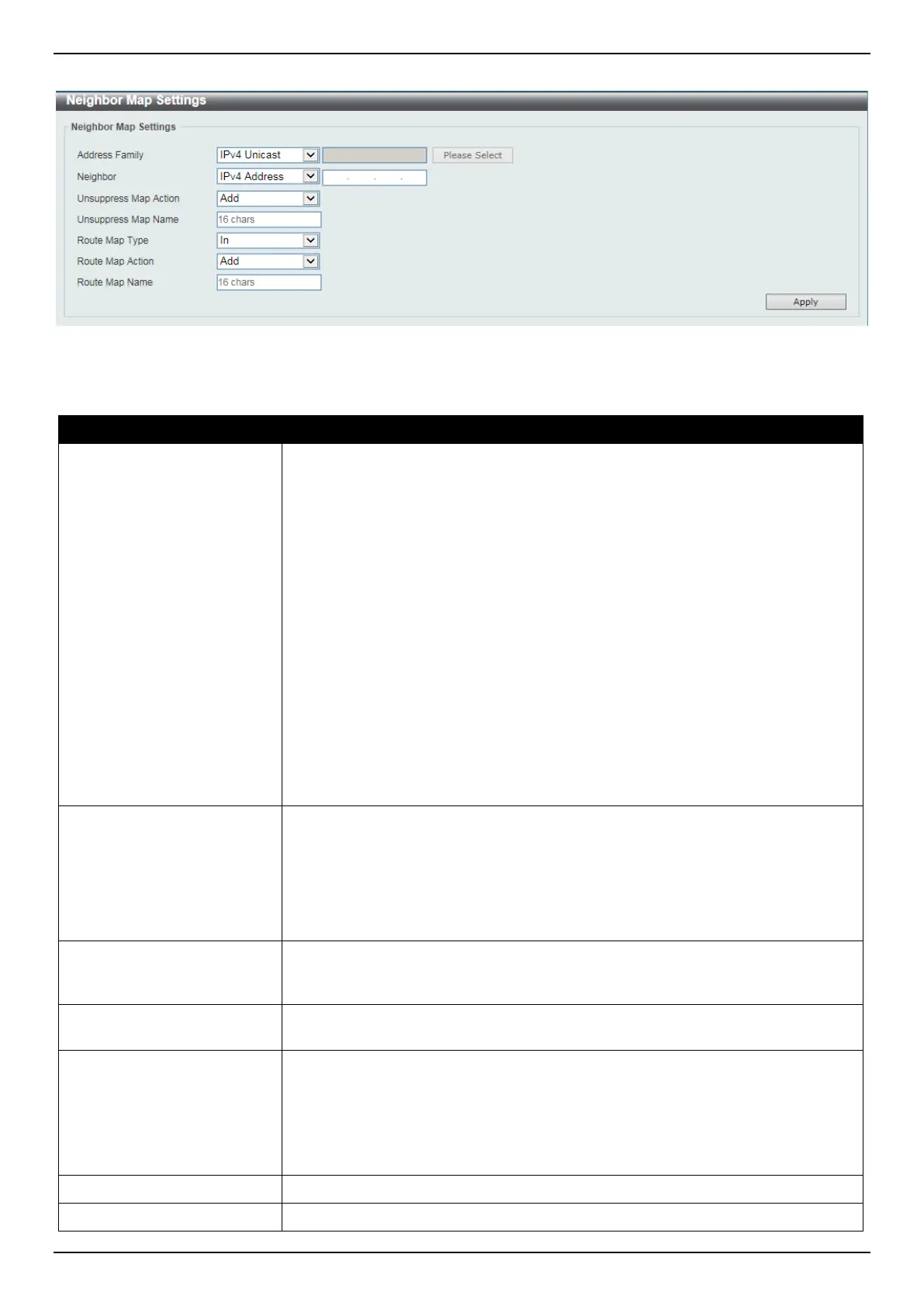 To view the following window, click L3 Features > BGP > BGP Neighbor > Neighbor Map Settings, as shown below: