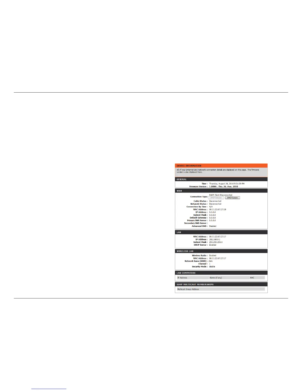 This page displays the current information for the DHP-1320. It will display the LAN, WAN (Internet), and Wireless information. If your Internet
