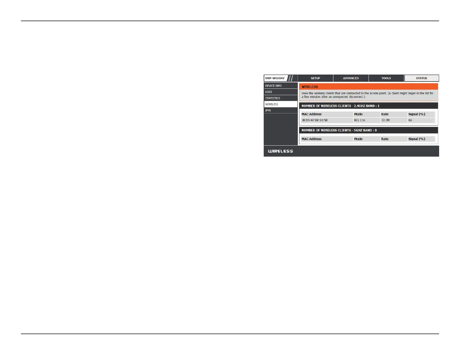 This section allows you to view the wireless devices that are connected to your DHP-W610AV on 2.4G and 5G bands.