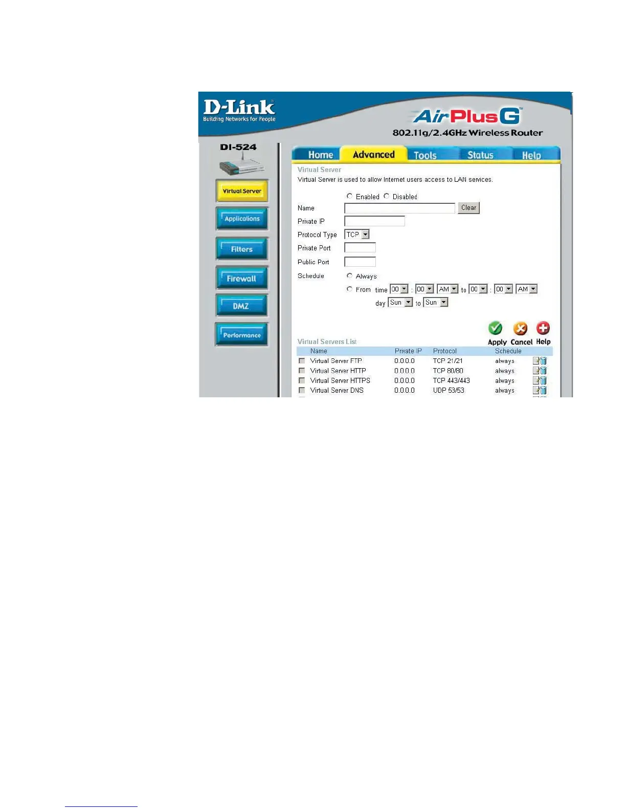 by enabling Virtual Server. Depending on the requested service, the DI-524 redirects
