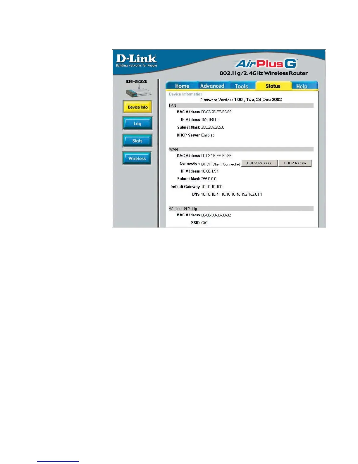 This page displays the current information for the DI-524. It will display the LAN, WAN,