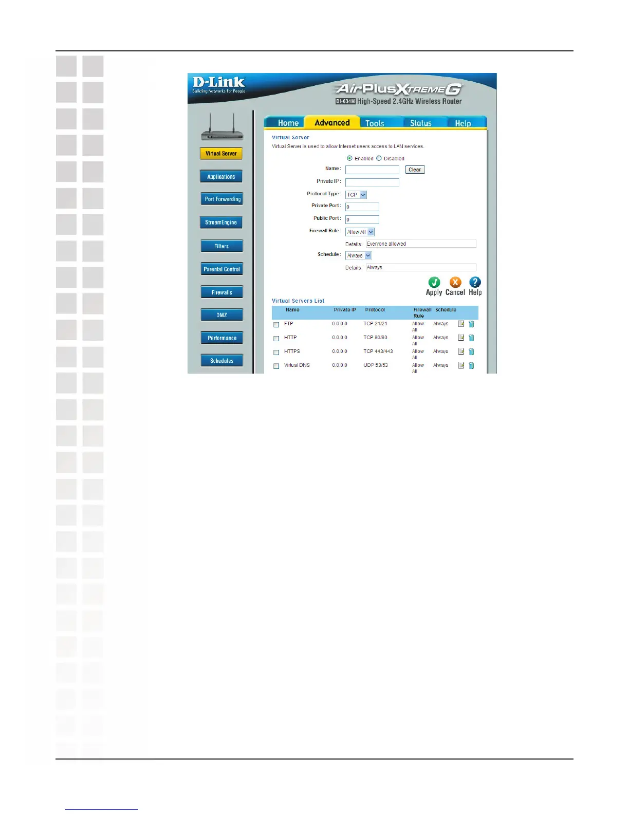 Note: Make sure DMZ host is disabled. If DMZ is enabled, it will disable all Virtual