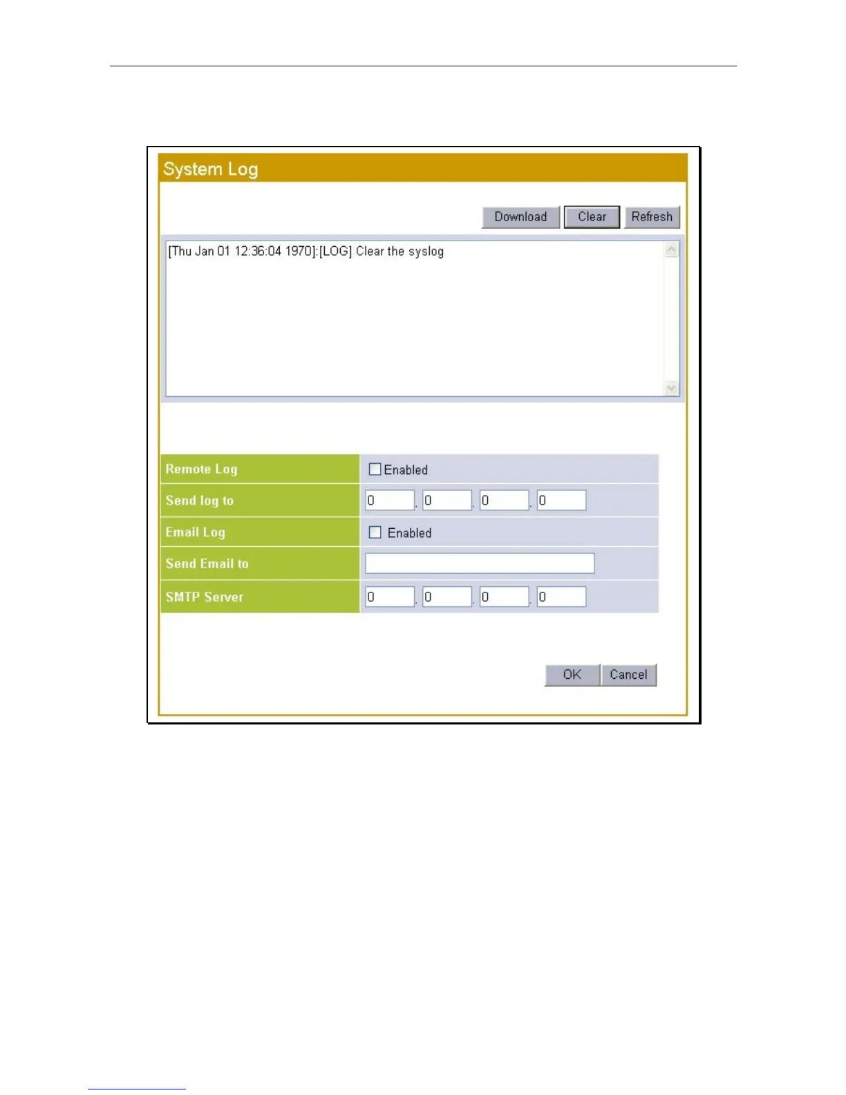 The System Log menu is used to view the log and setup notification for the Router.