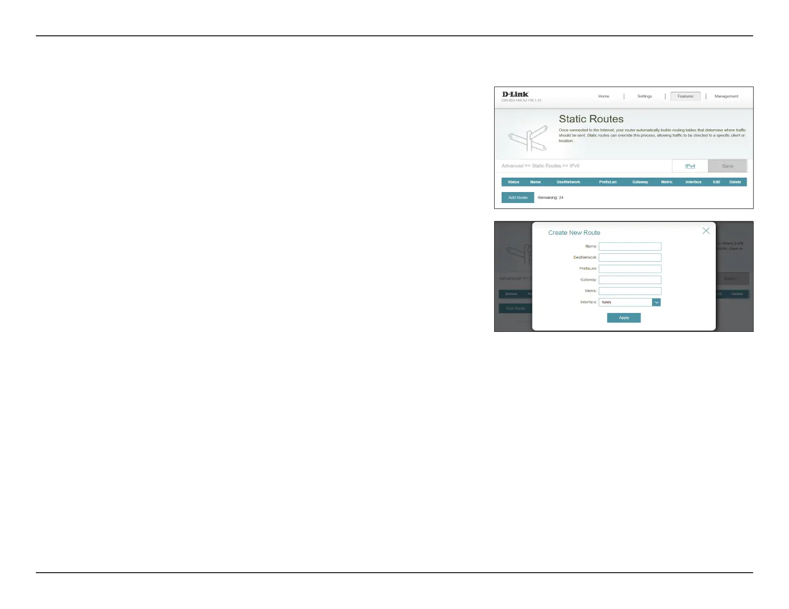 To congure IPv6 rules, on the Static Routes page click IPv6. To return to the