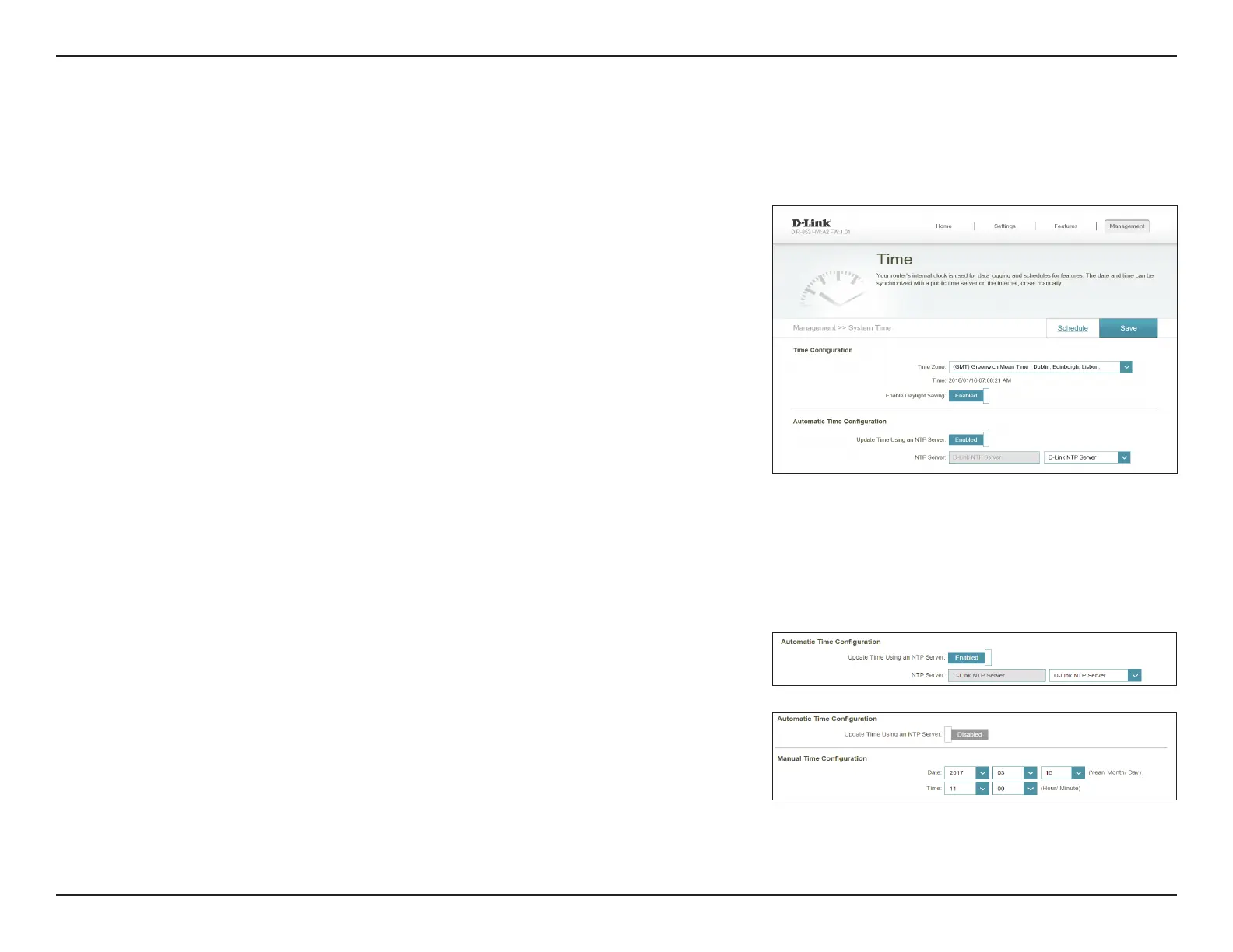 Network Time Protocol (NTP) server, and enable or disable daylight saving