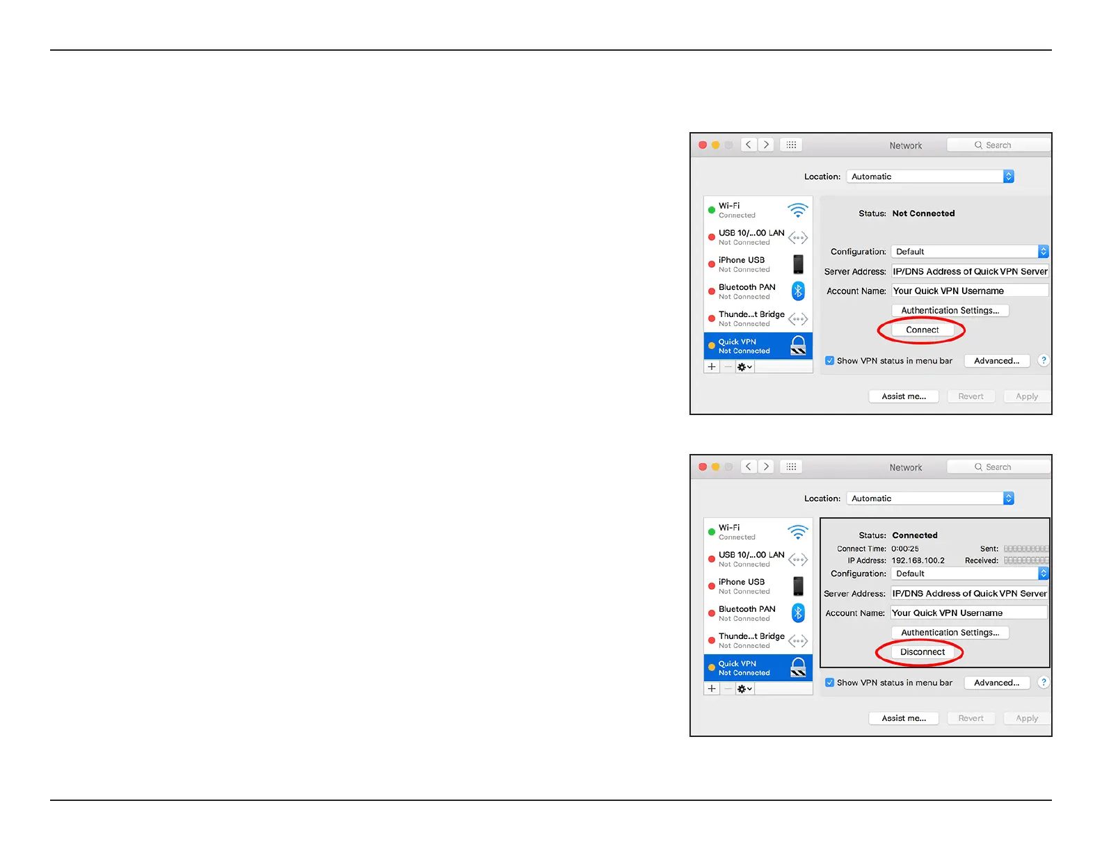 Select the Quick VPN connection and click on the Connect or Disconnect