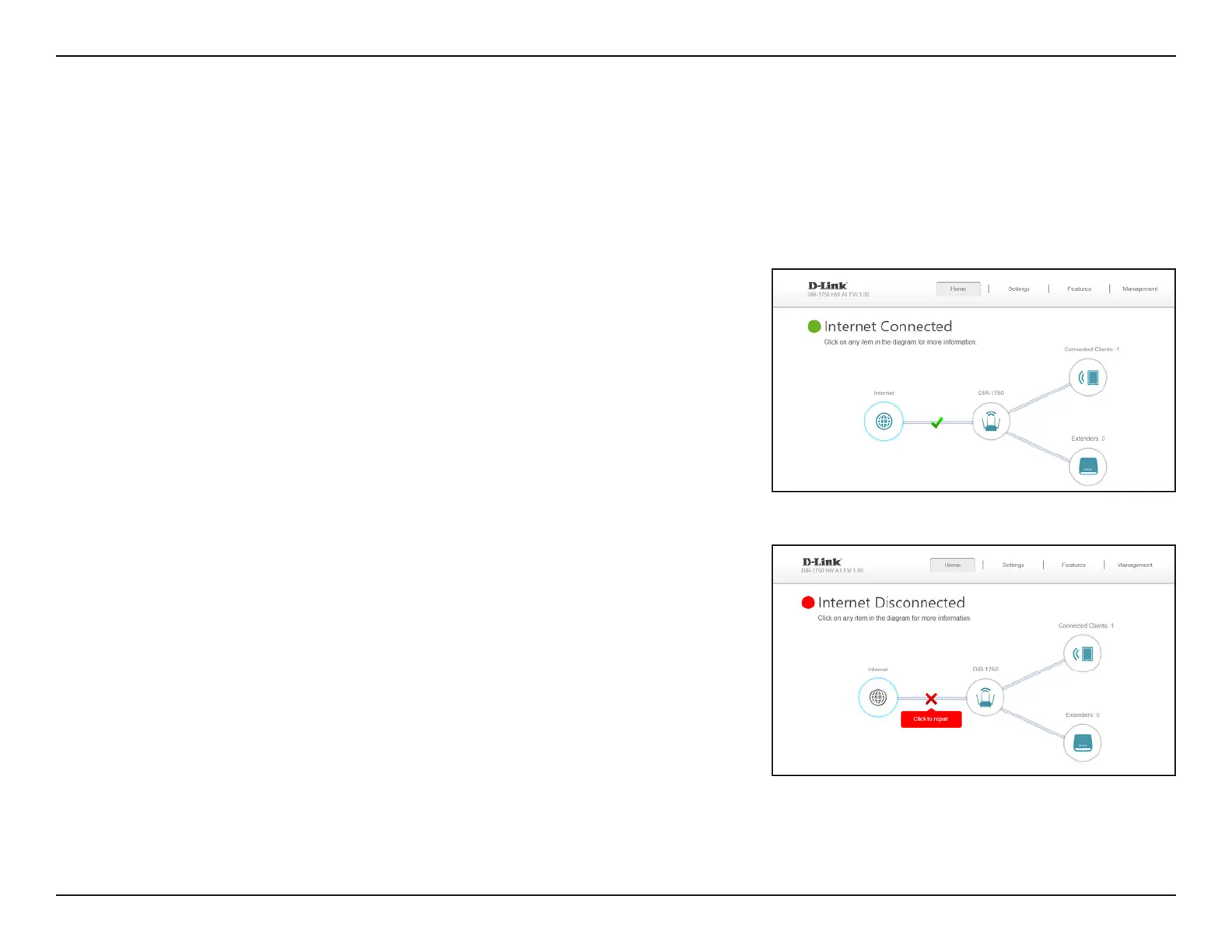 The Home page displays the current status of the router in the form of an interactive diagram. You can click each icon to