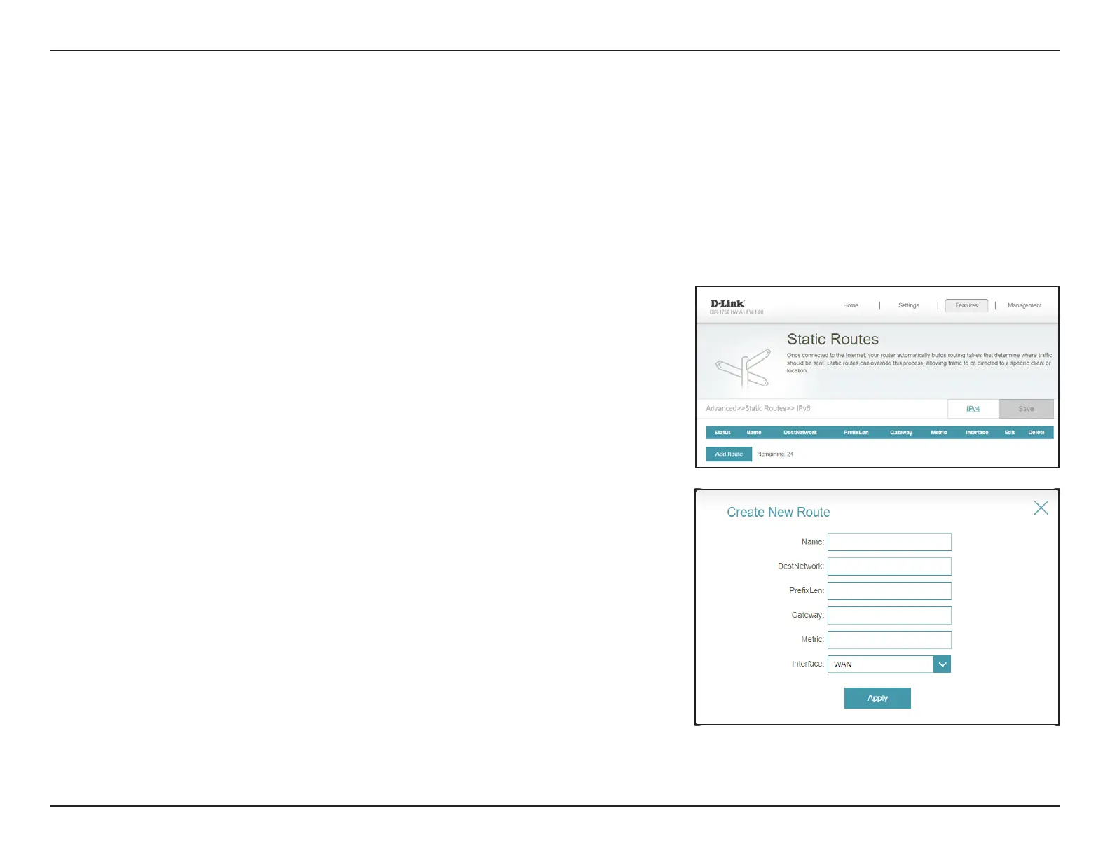 To congure the Static Route IPv4 settings, click the IPv4 link. Refer to Static Route - IPv4 on page 75