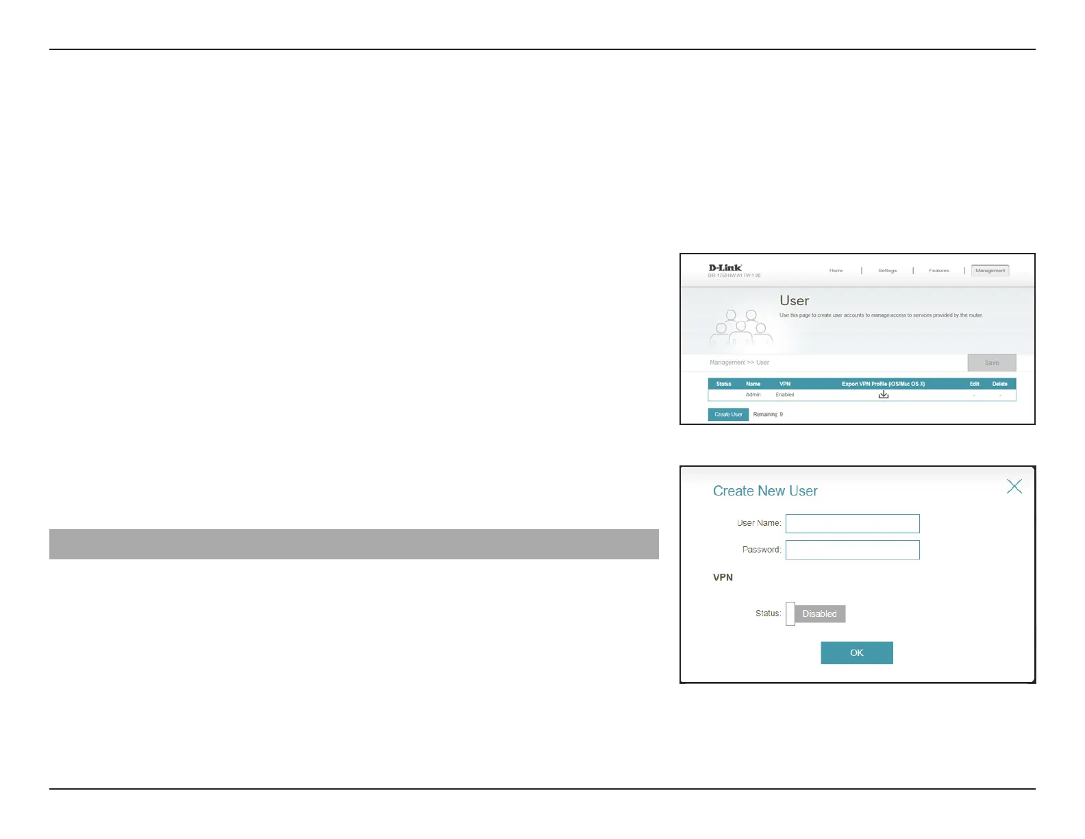 In the Management menu on the bar at the top of the page, click User. The User section is used to create, manage, and