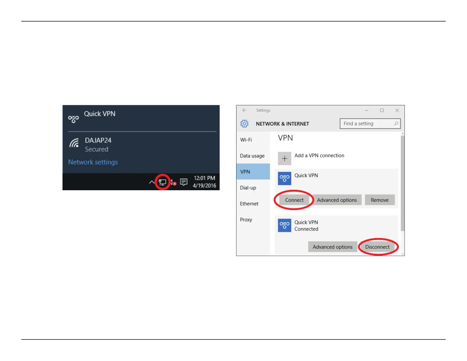 To connect to or disconnect from your Quick VPN server, click on the Network Settings icon in the notication area of the Windows taskbar and