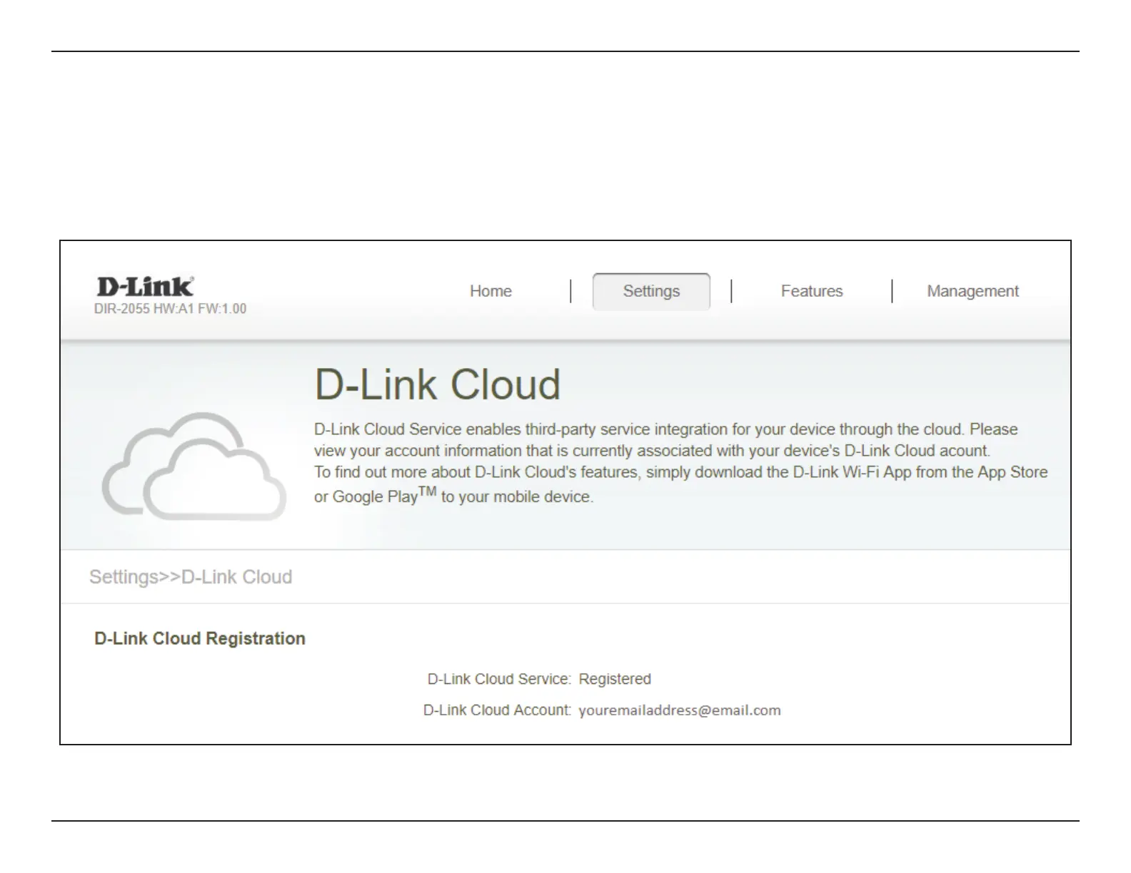 page lists whether you are registered with D-Link Cloud Service and email address associated with the account. Use the