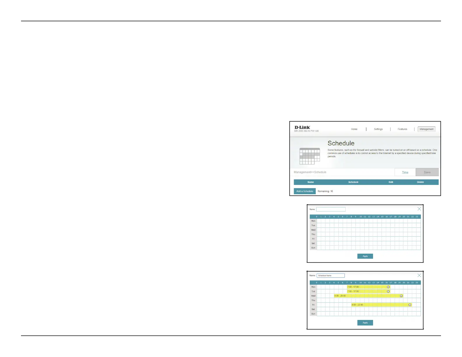 Schedule link. The Schedule page allows you to control some of the router functions through a pre-congured schedule.