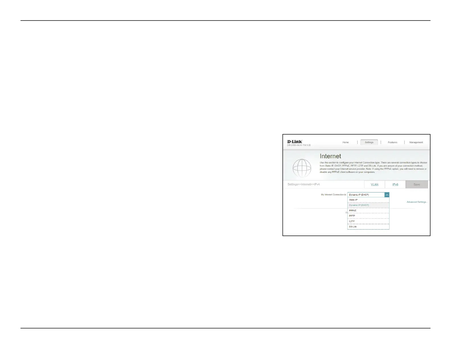 In the Settings menu on the bar at the top of the page, click Internet to see the Internet conguration options for the IPv4