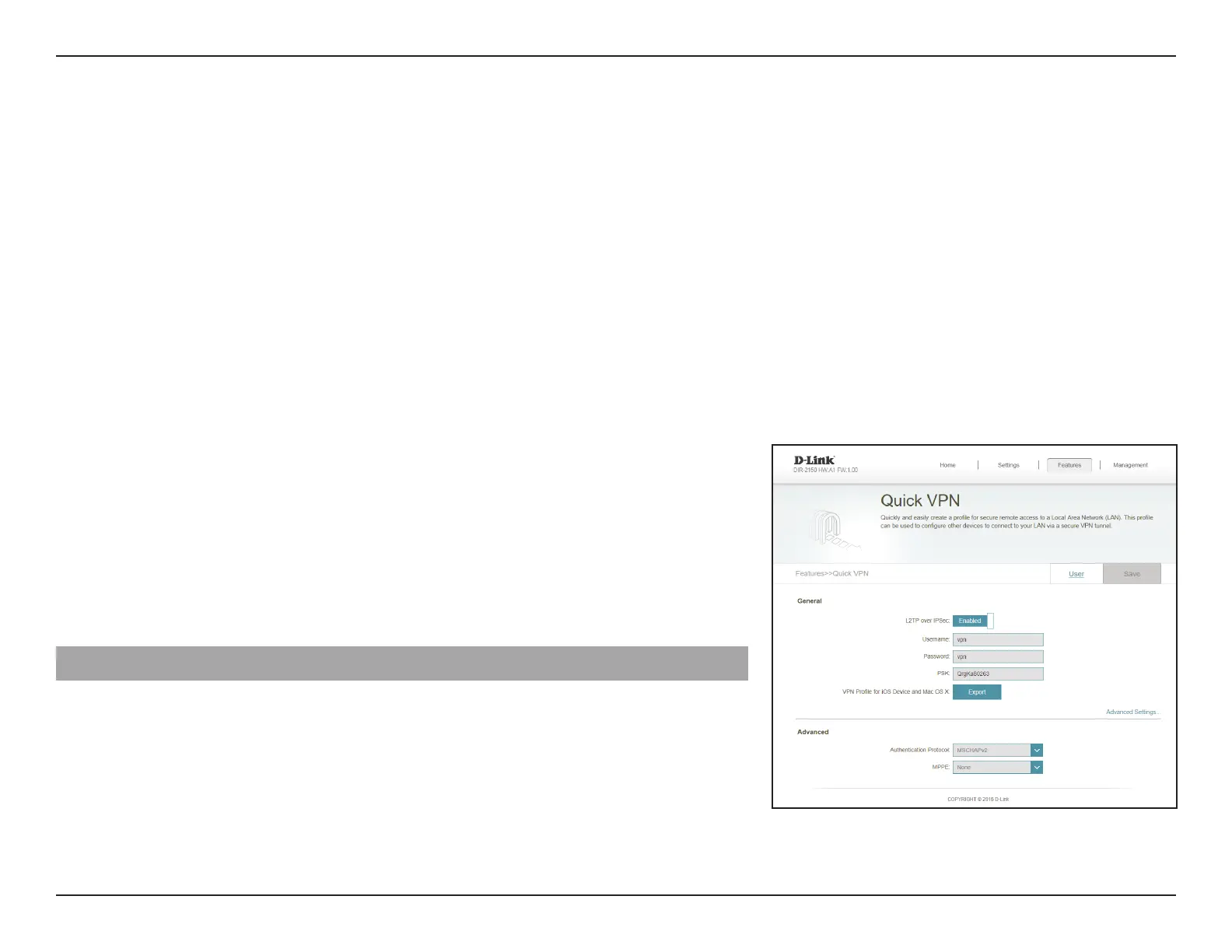 In the Features menu on the bar at the top of the page, click Quick VPN. This page will help you congure the Quick VPN