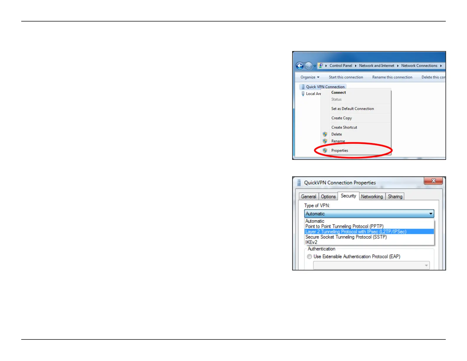 Right-click on the Quick VPN Connection you just created and left-click on
