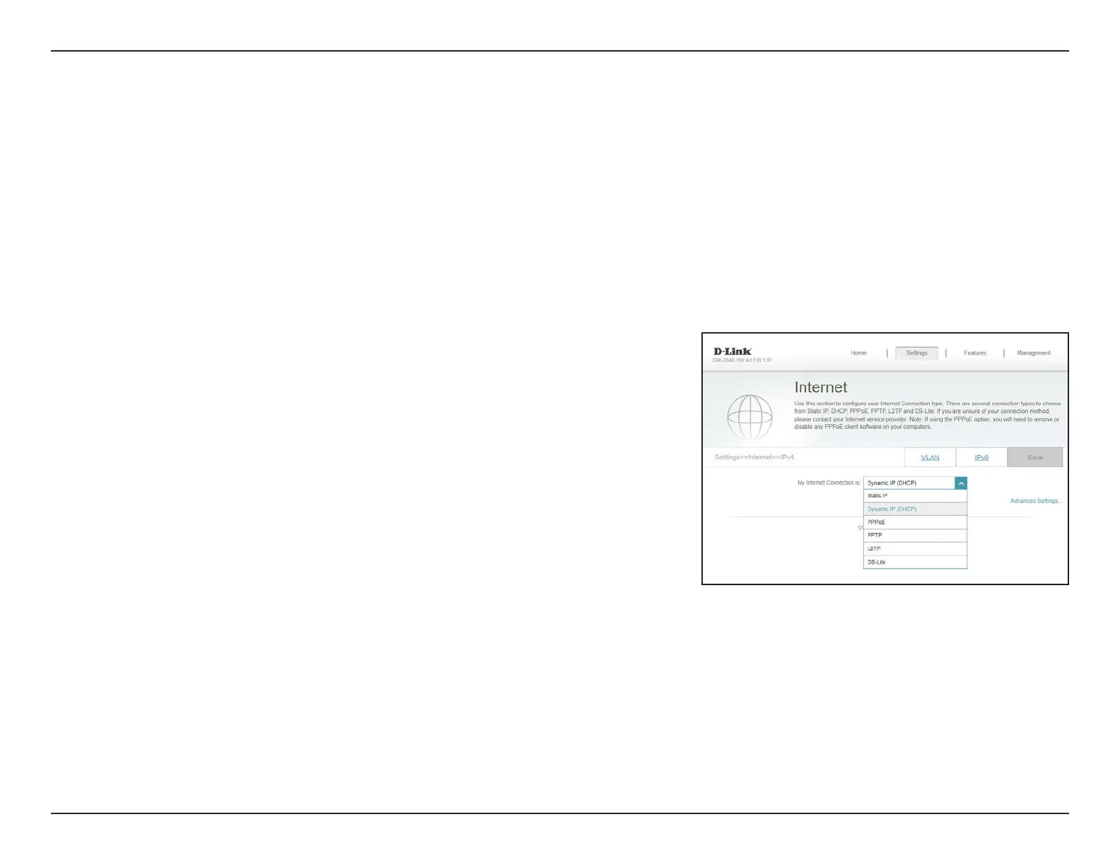 In the Settings menu on the bar at the top of the page, click Internet to see the Internet conguration options for the IPv4